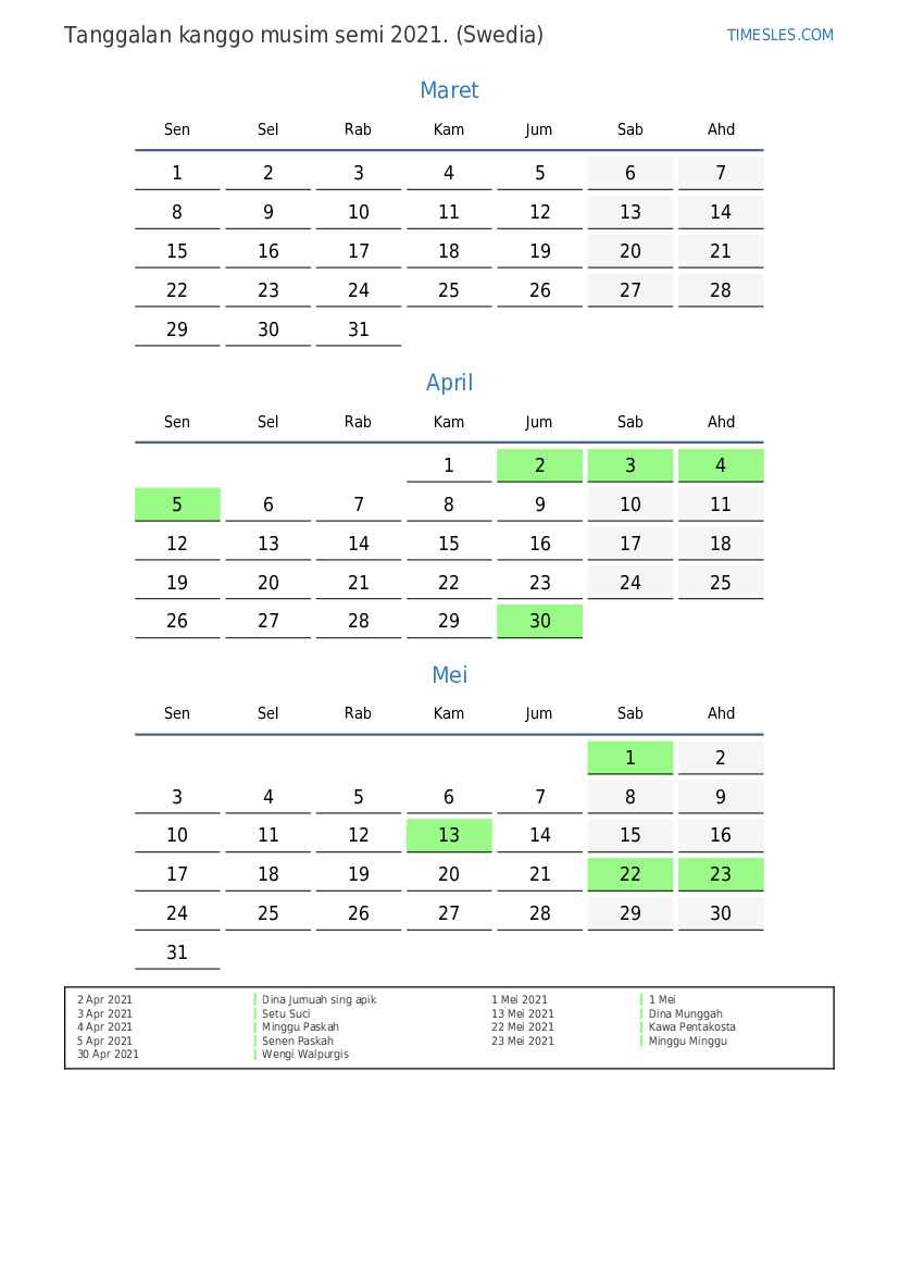 Download lan nyithak tanggalan PDF kanthi preinan lan akhir minggu kanggo musim semi taun 2021 kanggo Swedia