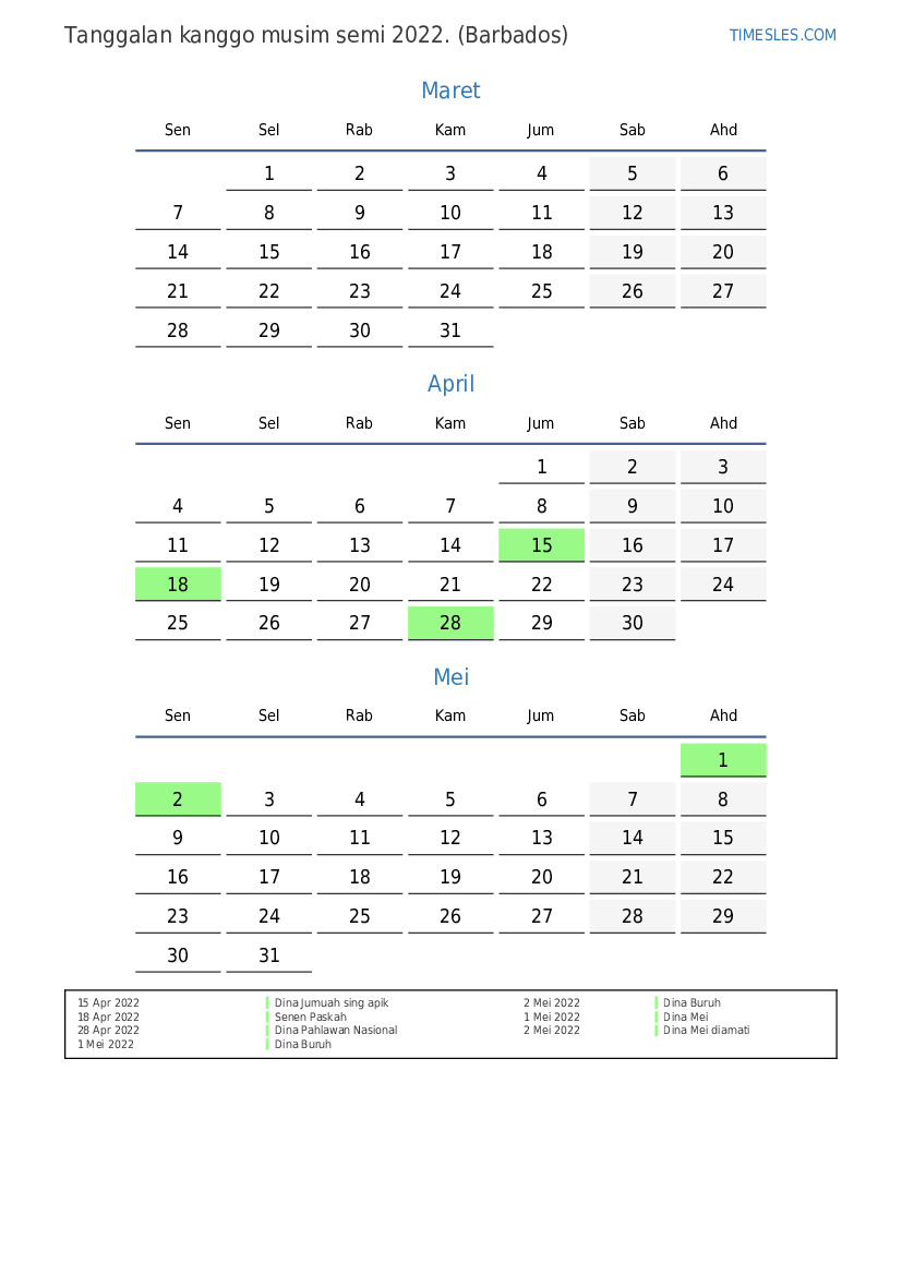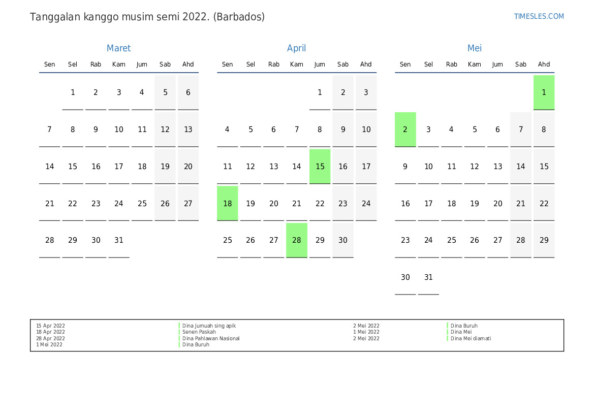 Download lan nyithak tanggalan PDF kanthi preinan lan akhir minggu kanggo musim semi taun 2022 kanggo Barbados