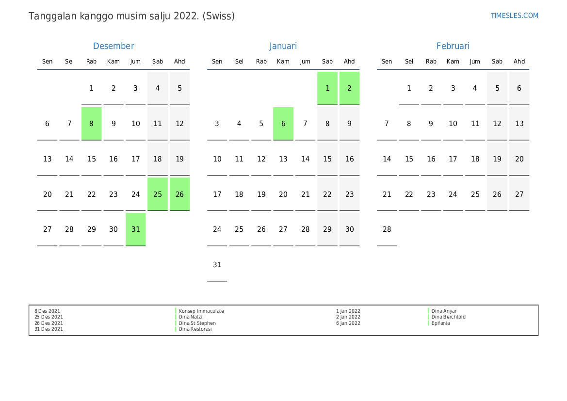 Kalender preinan lan akhir minggu kanggo musim semi taun 2022 kanggo Swiss
