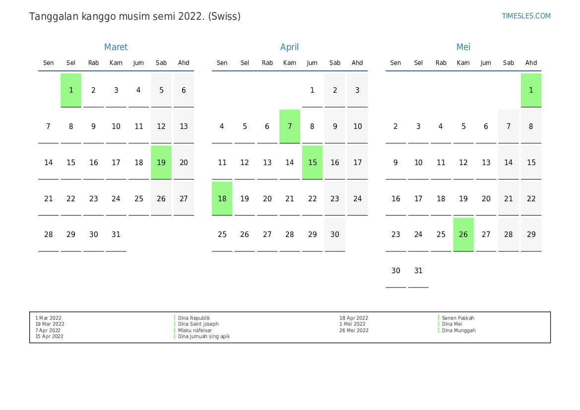 Download lan nyithak tanggalan PDF kanthi preinan lan akhir minggu kanggo musim semi taun 2022 kanggo Swiss