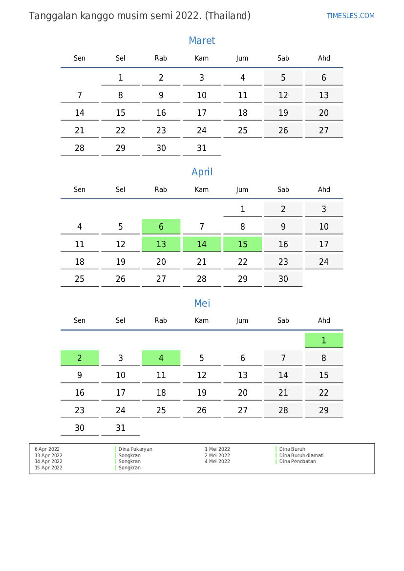Kalender preinan lan akhir minggu kanggo musim semi taun 2022 kanggo Thailand