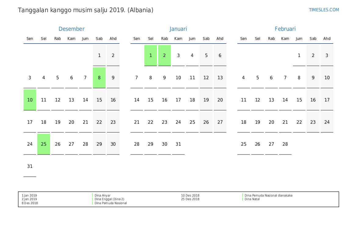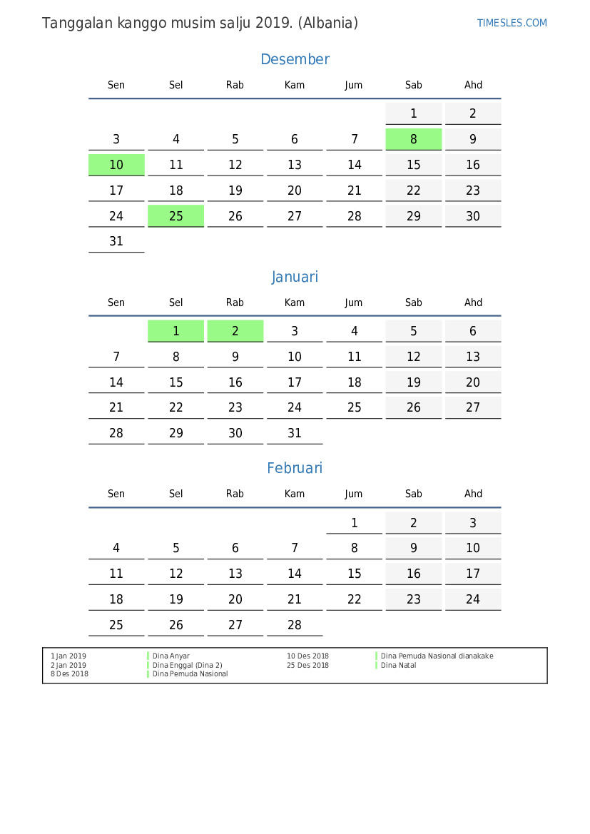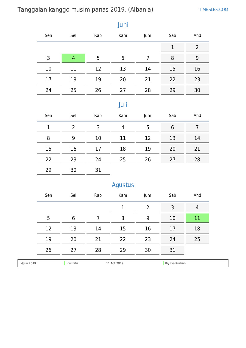 Download lan nyithak tanggalan PDF kanthi preinan lan akhir minggu kanggo musim panas taun 2019 kanggo Albania