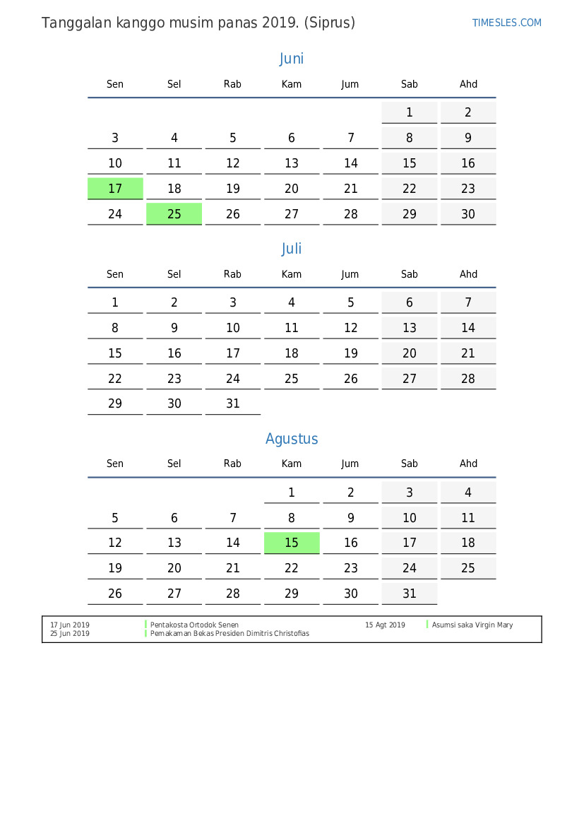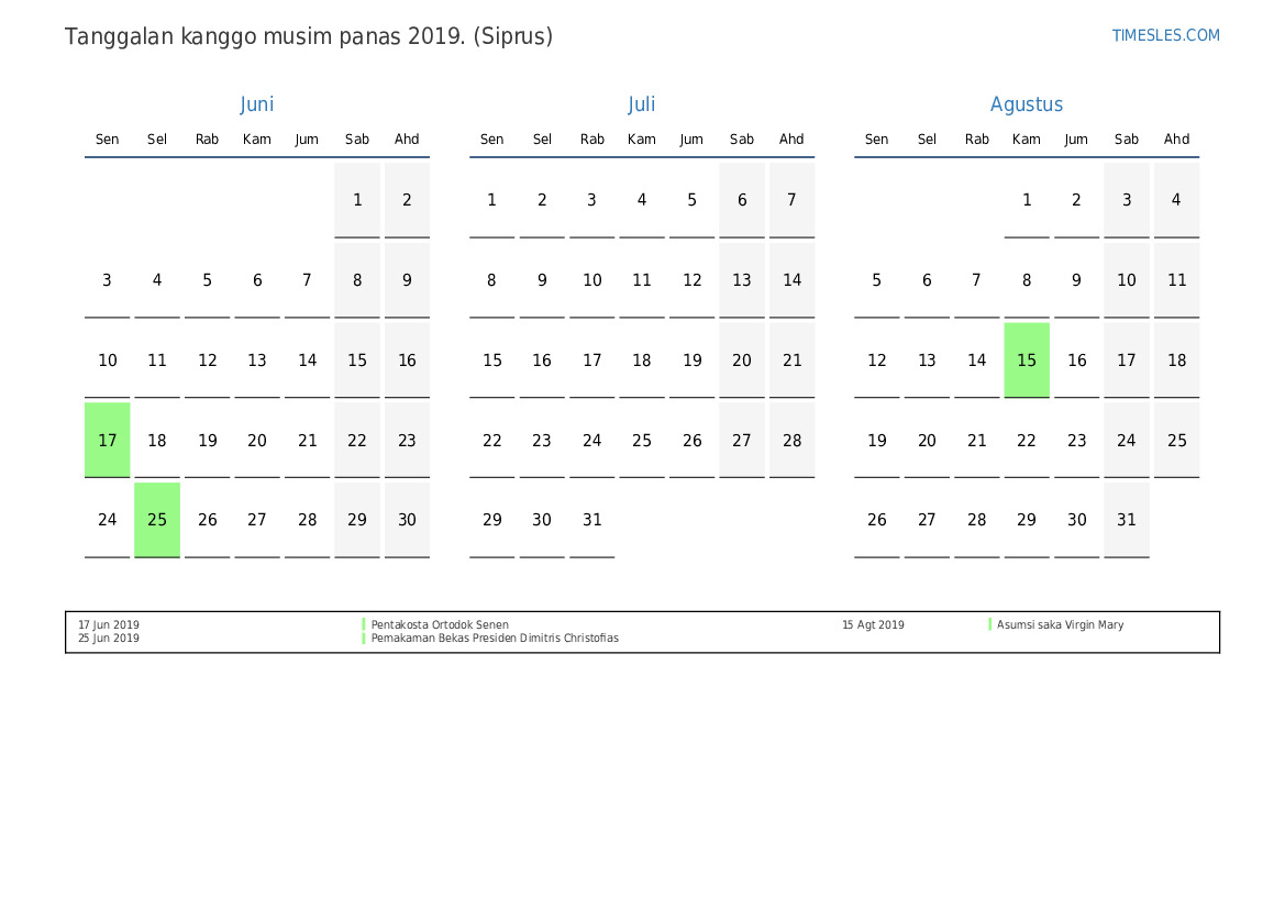 Download lan nyithak tanggalan PDF kanthi preinan lan akhir minggu kanggo musim panas taun 2019 kanggo Siprus