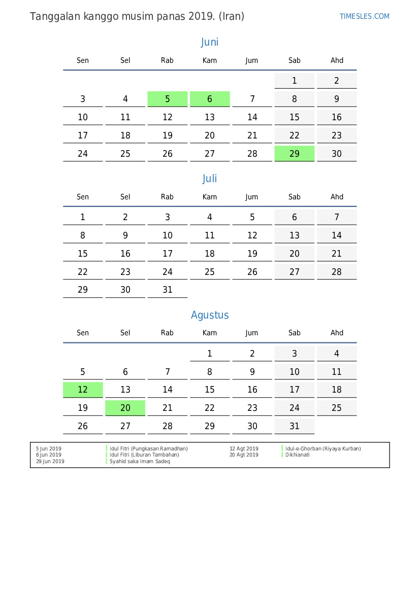 Download lan nyithak tanggalan PDF kanthi preinan lan akhir minggu kanggo musim panas taun 2019 kanggo Iran