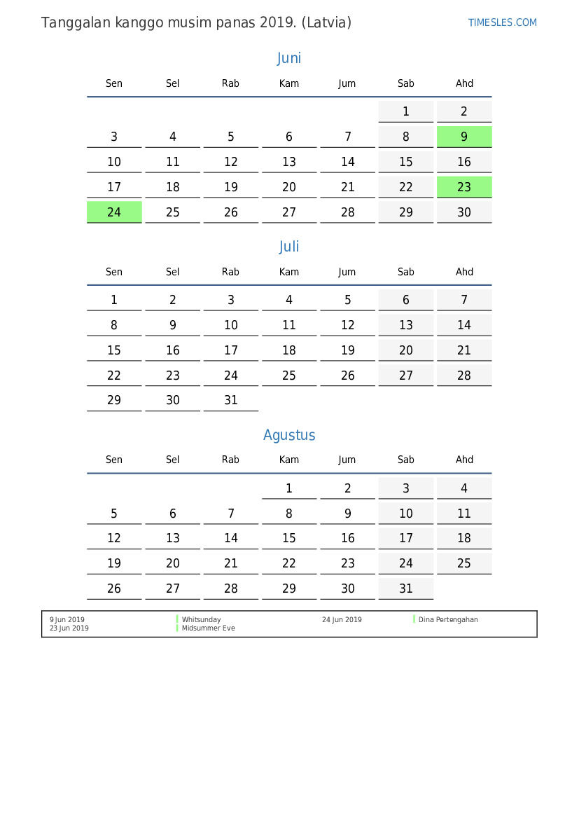 Kalender preinan lan akhir minggu kanggo musim panas taun 2019 kanggo Latvia