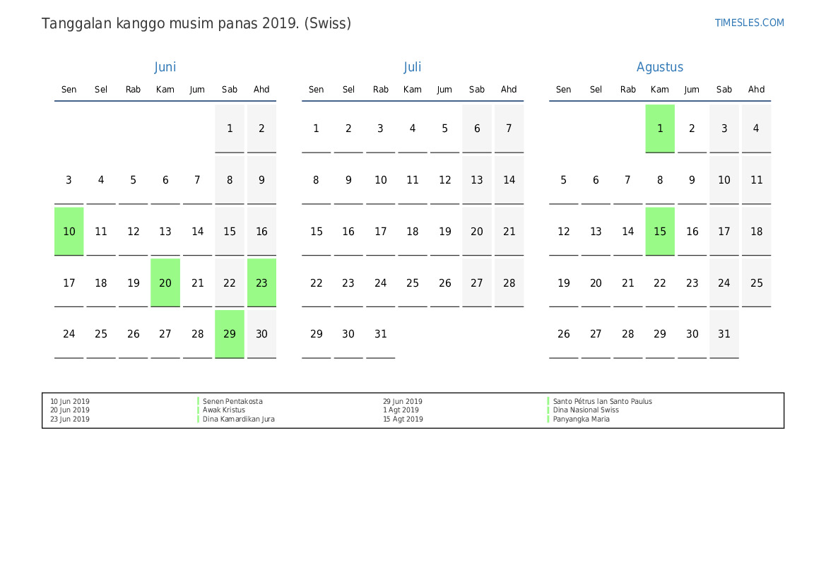 Kalender preinan lan akhir minggu kanggo musim panas taun 2019 kanggo Swiss