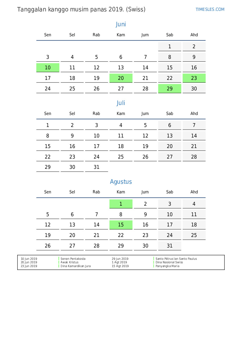 Download lan nyithak tanggalan PDF kanthi preinan lan akhir minggu kanggo musim panas taun 2019 kanggo Swiss