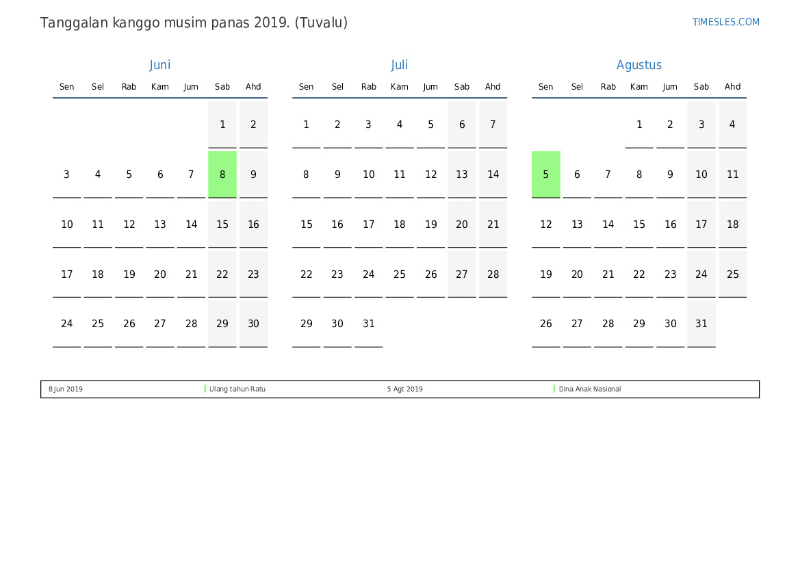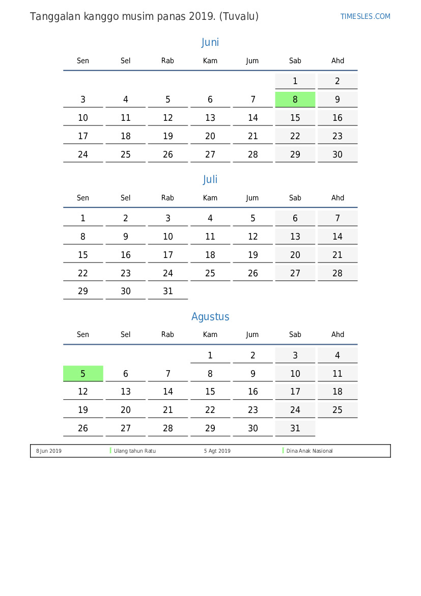 Download lan nyithak tanggalan PDF kanthi preinan lan akhir minggu kanggo musim panas taun 2019 kanggo Tuvalu