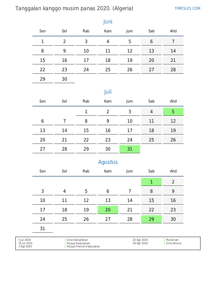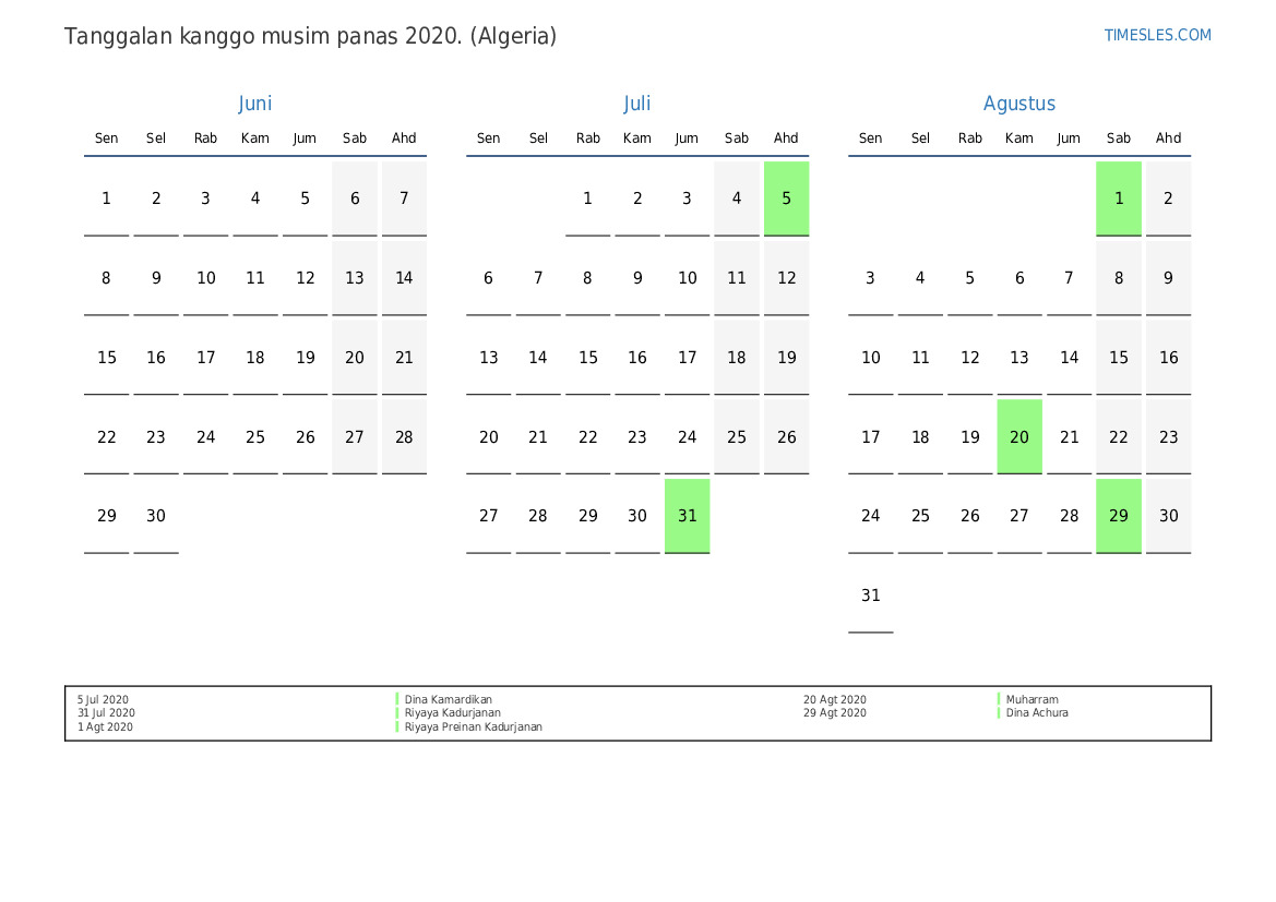 Download lan nyithak tanggalan PDF kanthi preinan lan akhir minggu kanggo musim panas taun 2020 kanggo Algeria