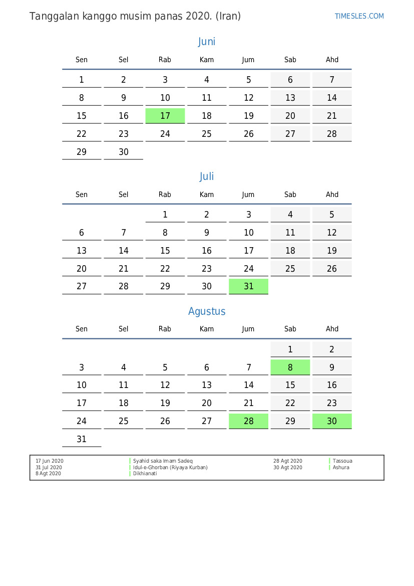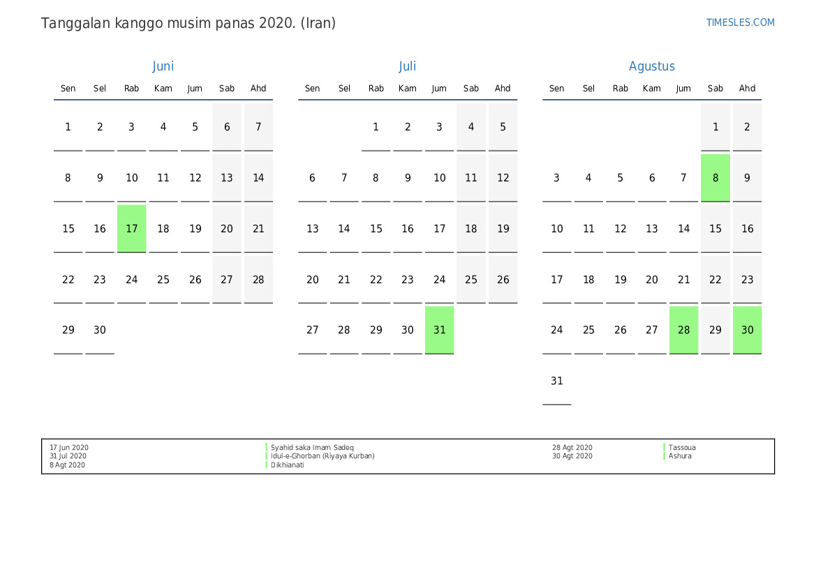 Download lan nyithak tanggalan PDF kanthi preinan lan akhir minggu kanggo musim panas taun 2020 kanggo Iran
