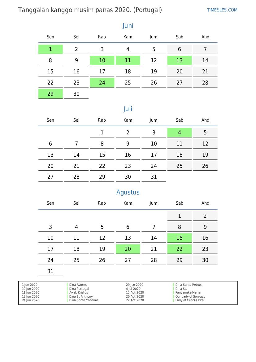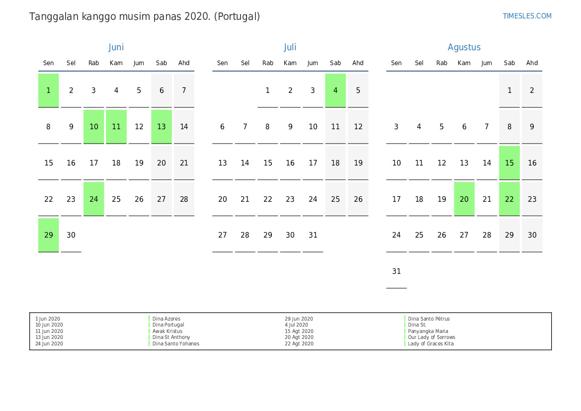Download lan nyithak tanggalan PDF kanthi preinan lan akhir minggu kanggo musim panas taun 2020 kanggo Portugal