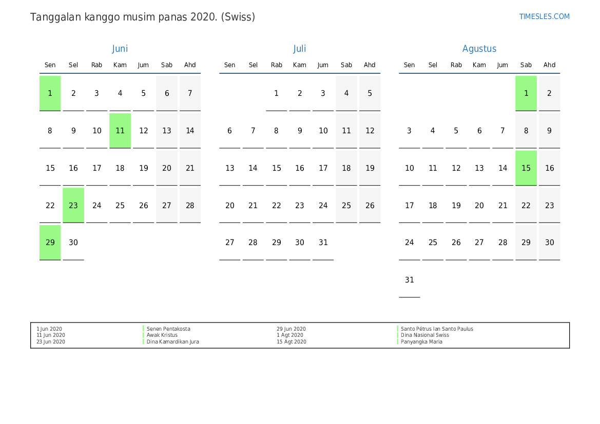 Download lan nyithak tanggalan PDF kanthi preinan lan akhir minggu kanggo musim panas taun 2020 kanggo Swiss