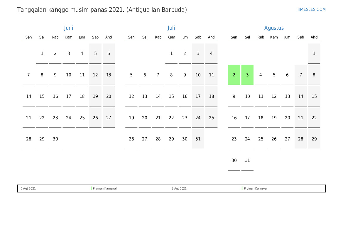Download lan nyithak tanggalan PDF kanthi preinan lan akhir minggu kanggo musim panas taun 2021 kanggo Antigua lan Barbuda
