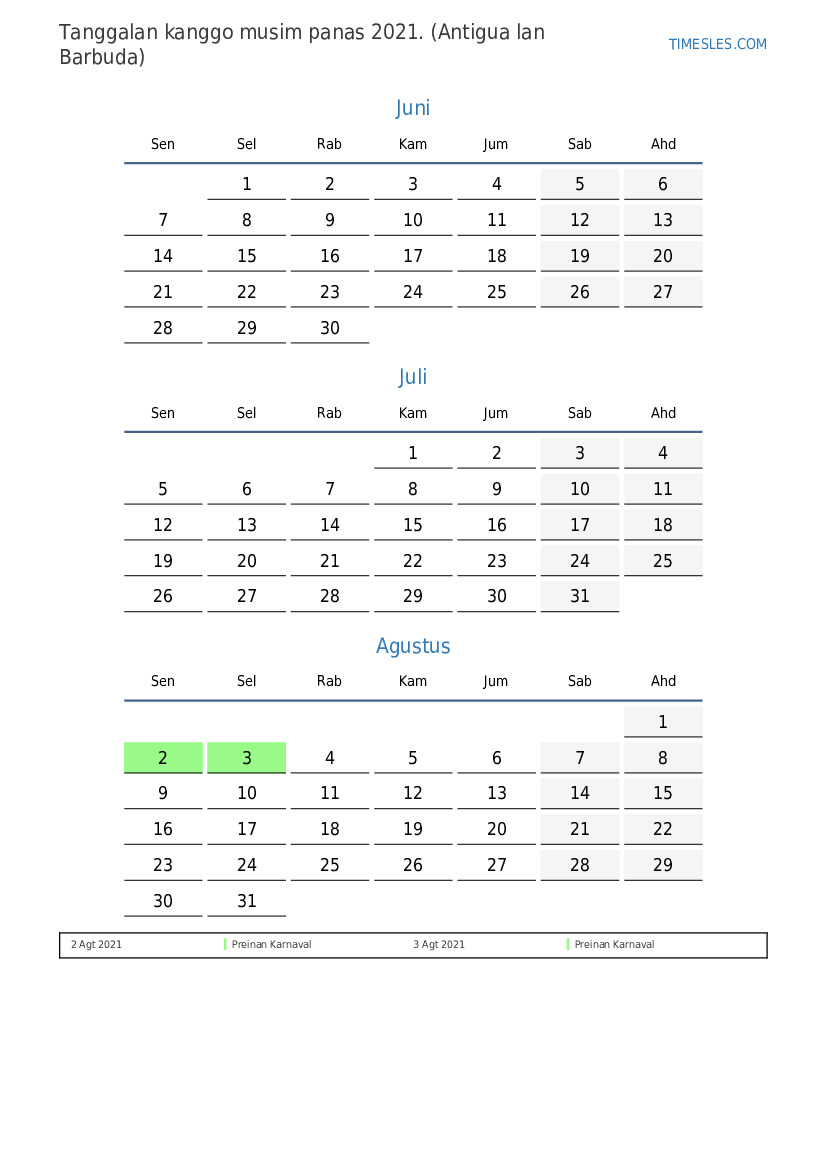 Kalender preinan lan akhir minggu kanggo musim panas taun 2021 kanggo Antigua lan Barbuda