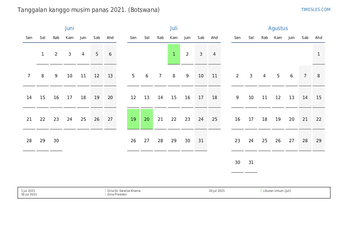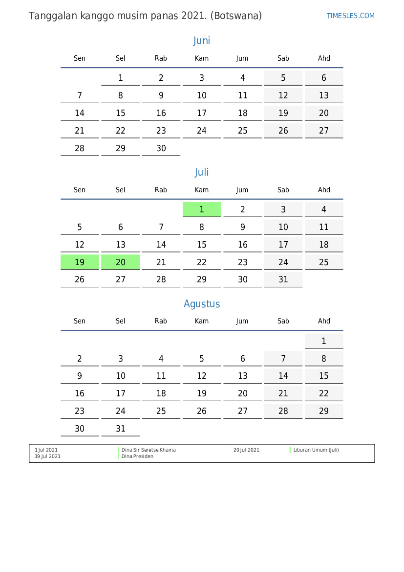 Kalender preinan lan akhir minggu kanggo musim panas taun 2021 kanggo Botswana