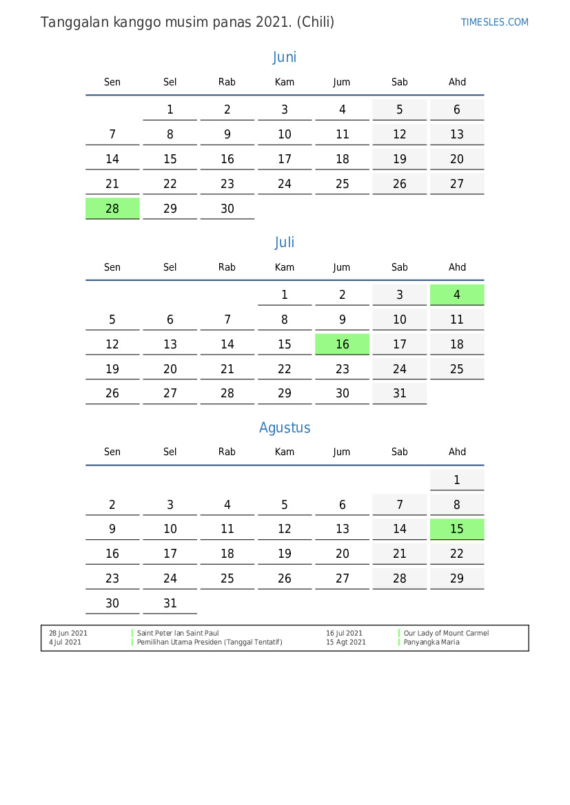 Download lan nyithak tanggalan PDF kanthi preinan lan akhir minggu kanggo musim panas taun 2021 kanggo Chili