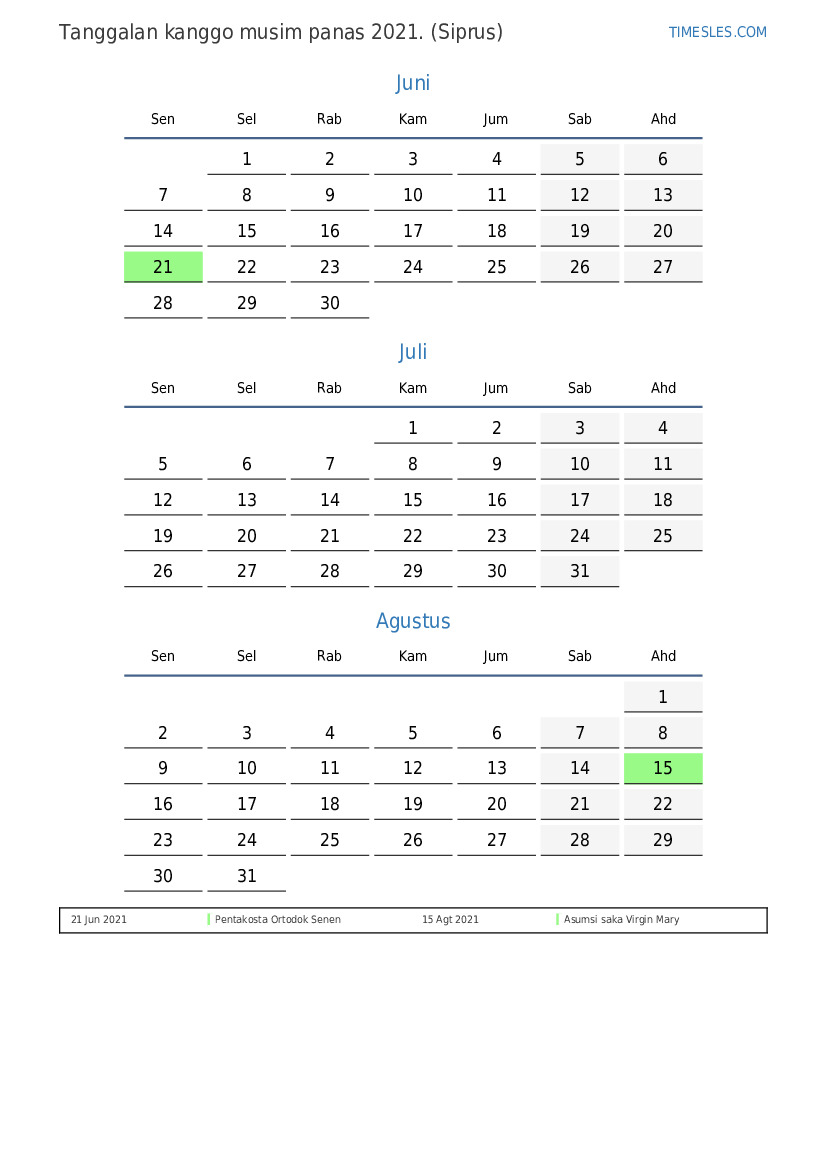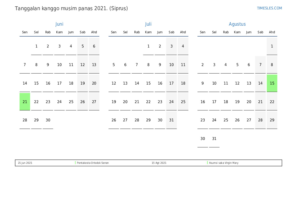 Download lan nyithak tanggalan PDF kanthi preinan lan akhir minggu kanggo musim panas taun 2021 kanggo Siprus