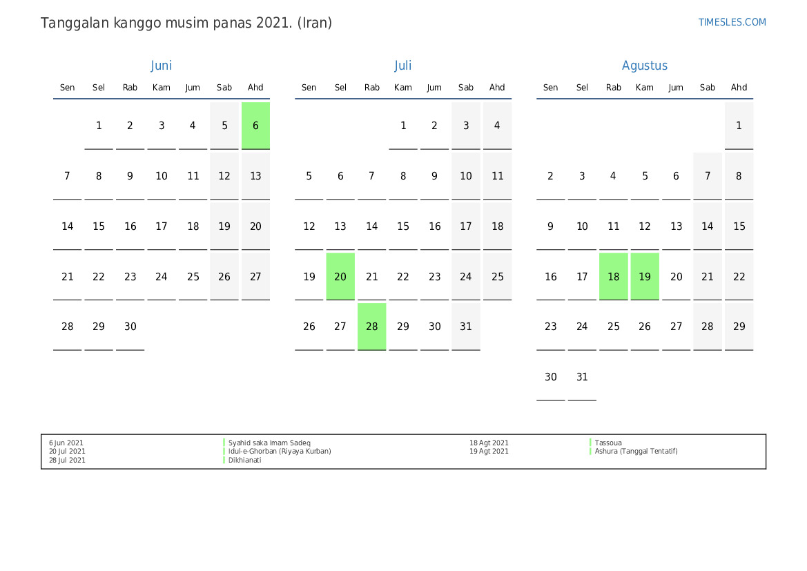 Download lan nyithak tanggalan PDF kanthi preinan lan akhir minggu kanggo musim panas taun 2021 kanggo Iran