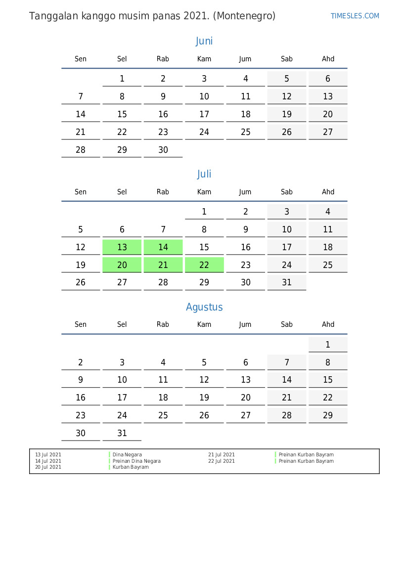 Download lan nyithak tanggalan PDF kanthi preinan lan akhir minggu kanggo musim panas taun 2021 kanggo Montenegro
