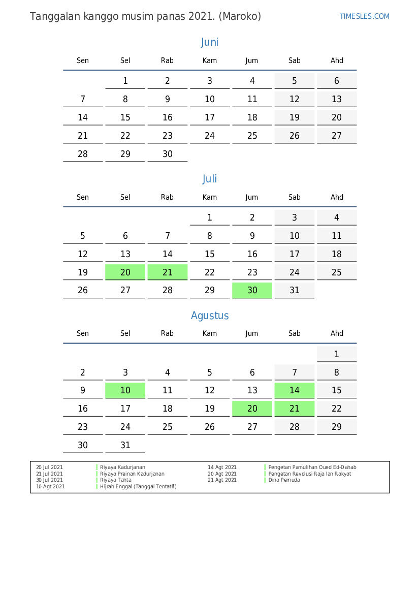 Download lan nyithak tanggalan PDF kanthi preinan lan akhir minggu kanggo musim panas taun 2021 kanggo Maroko
