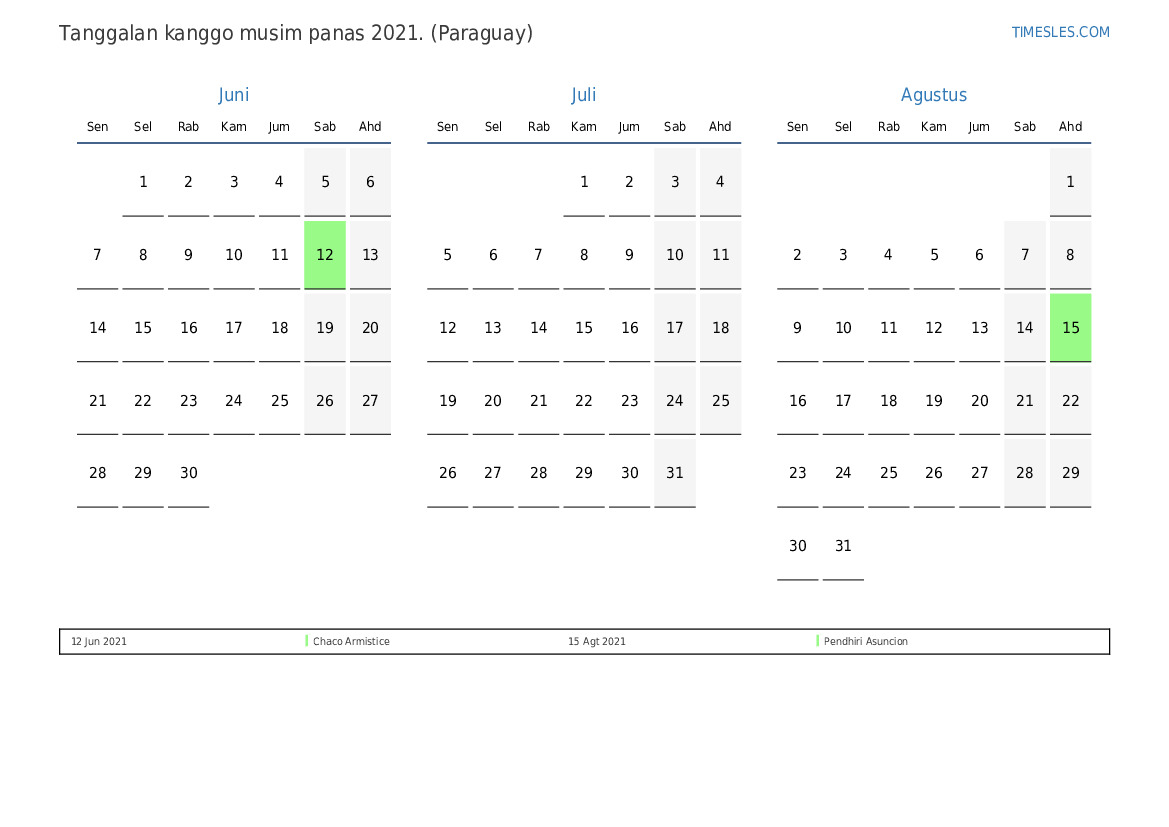 Download lan nyithak tanggalan PDF kanthi preinan lan akhir minggu kanggo musim panas taun 2021 kanggo Paraguay