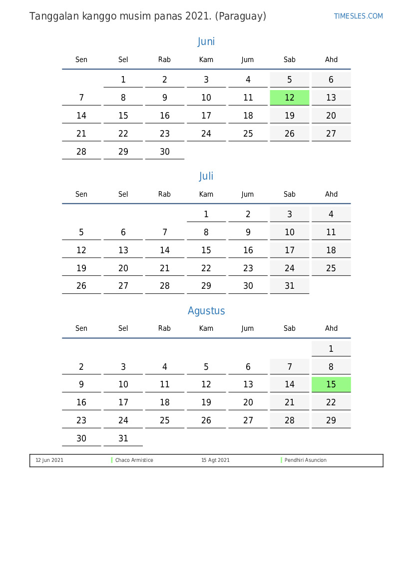 Ing mangsa panas 2021, ana 3 preinan lan dina dina ing Paraguay. Panas 2021 diwiwiti dina selasa lan rampung dina selasa.