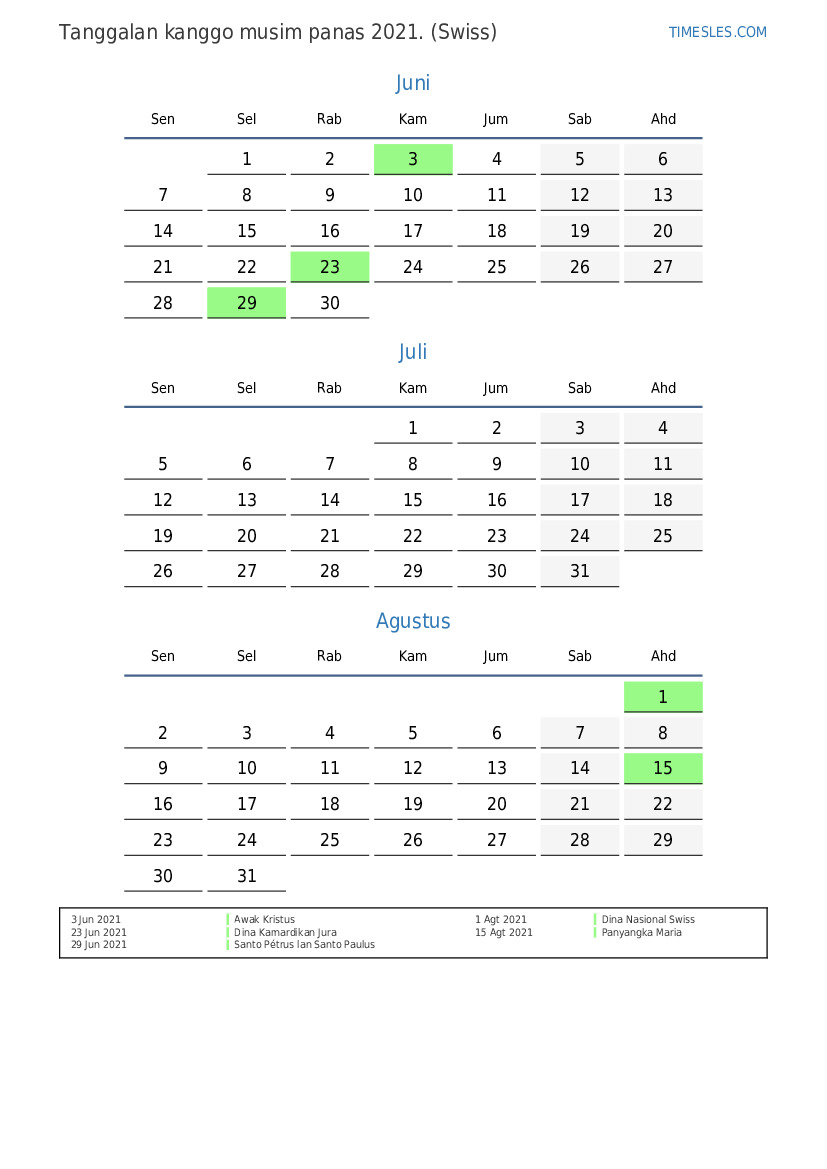 Ing mangsa panas 2021, ana 6 preinan lan dina dina ing Swiss. Panas 2021 diwiwiti dina selasa lan rampung dina selasa.