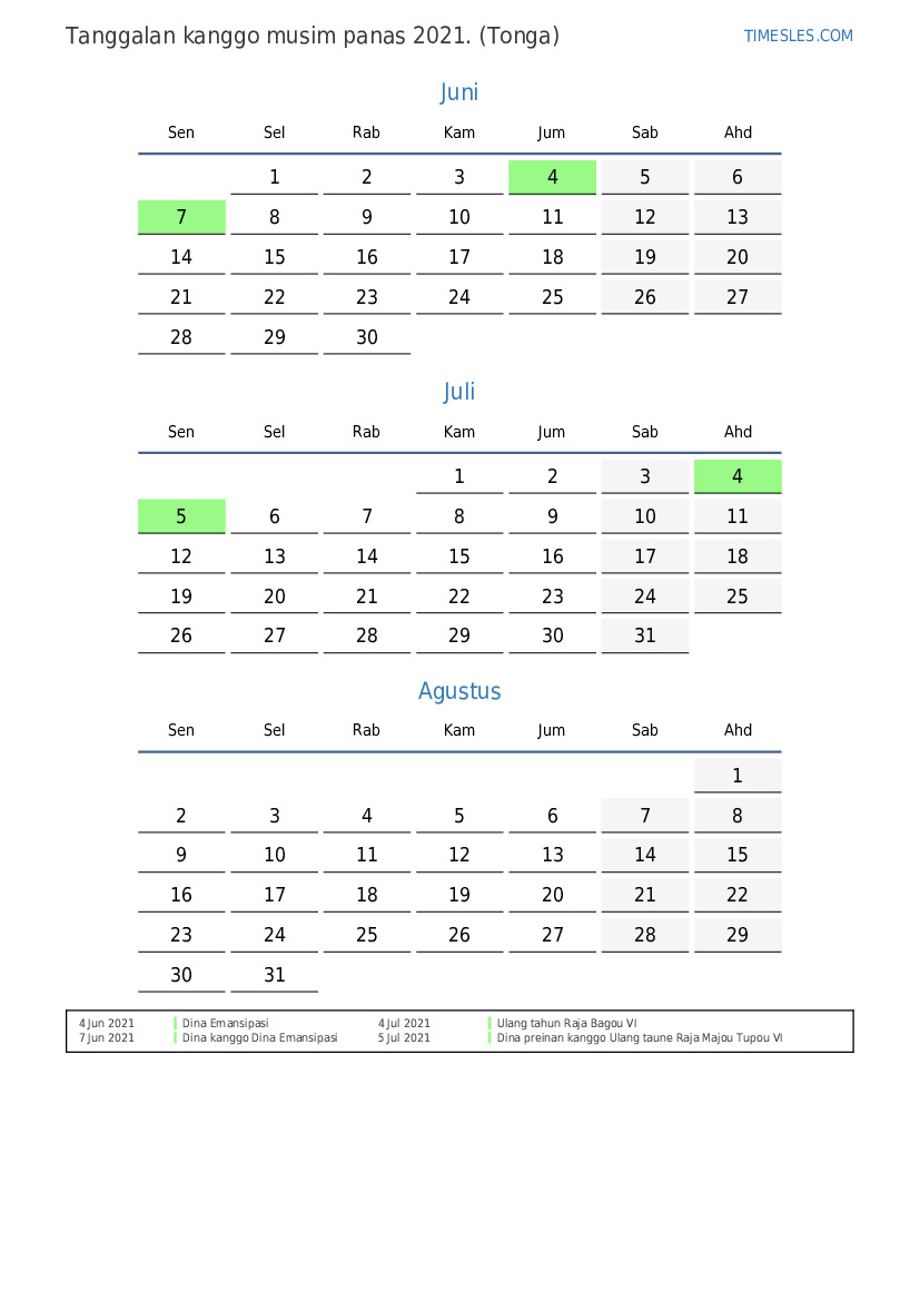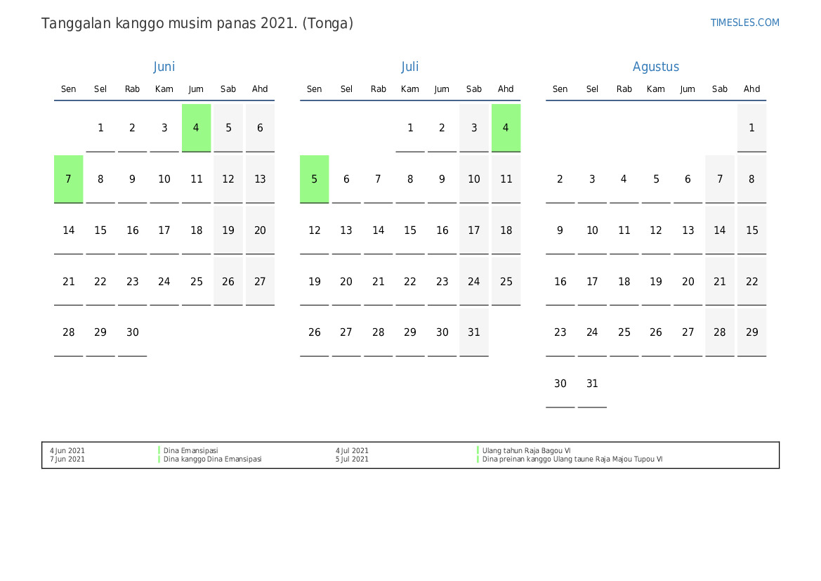 Download lan nyithak tanggalan PDF kanthi preinan lan akhir minggu kanggo musim panas taun 2021 kanggo Tonga