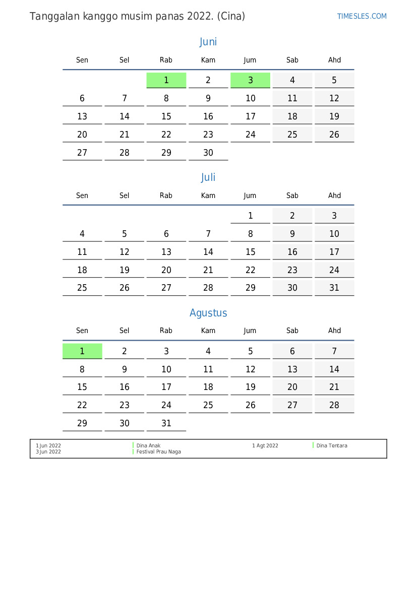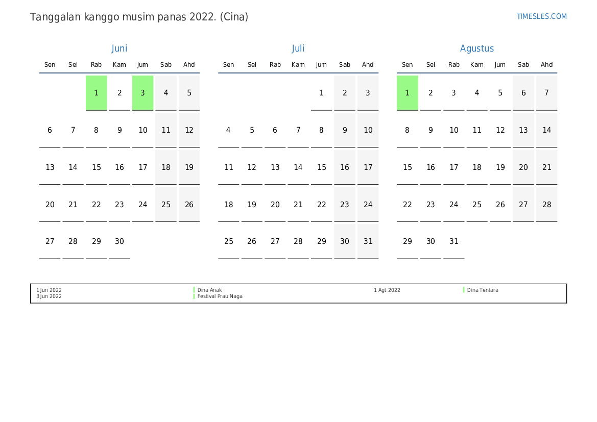 Download lan nyithak tanggalan PDF kanthi preinan lan akhir minggu kanggo musim panas taun 2022 kanggo China