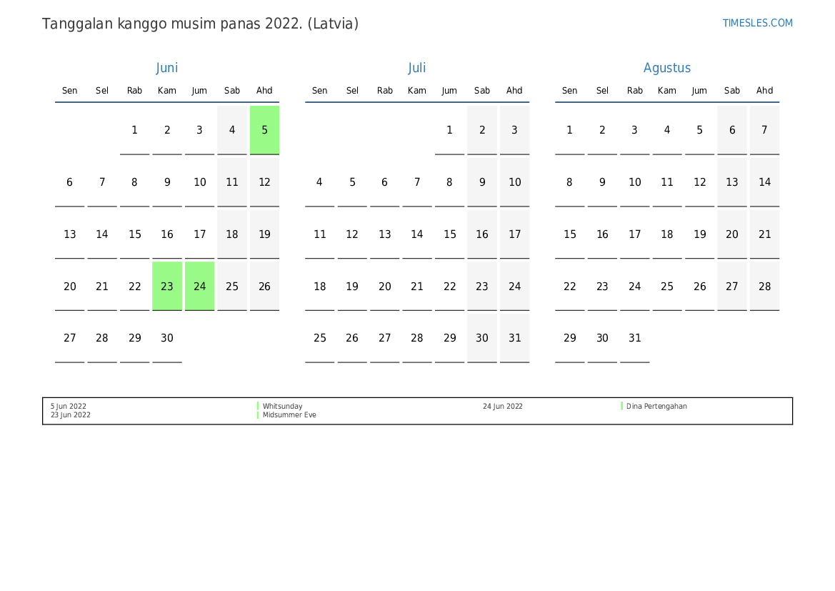 Kalender preinan lan akhir minggu kanggo musim panas taun 2022 kanggo Latvia
