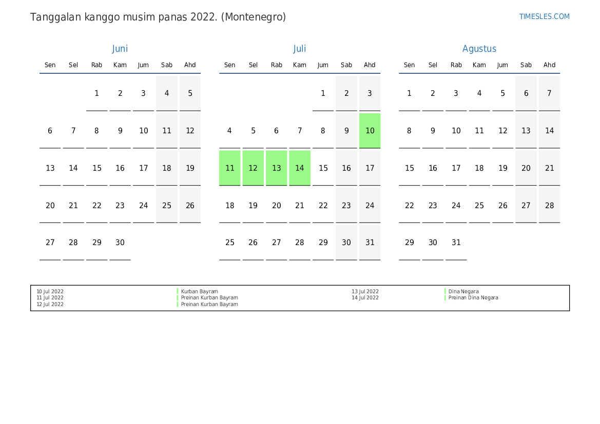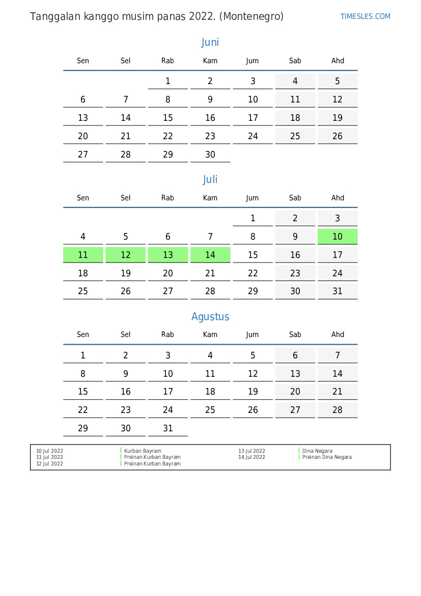 Download lan nyithak tanggalan PDF kanthi preinan lan akhir minggu kanggo musim panas taun 2022 kanggo Montenegro