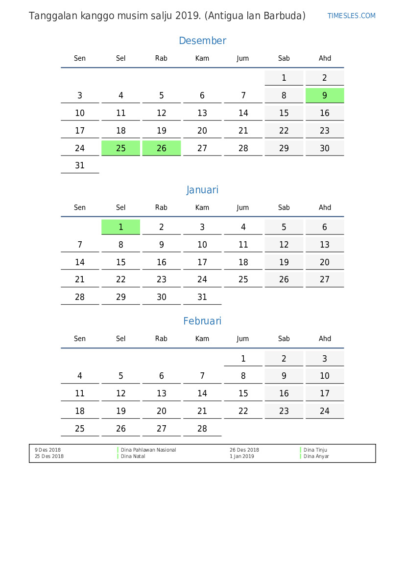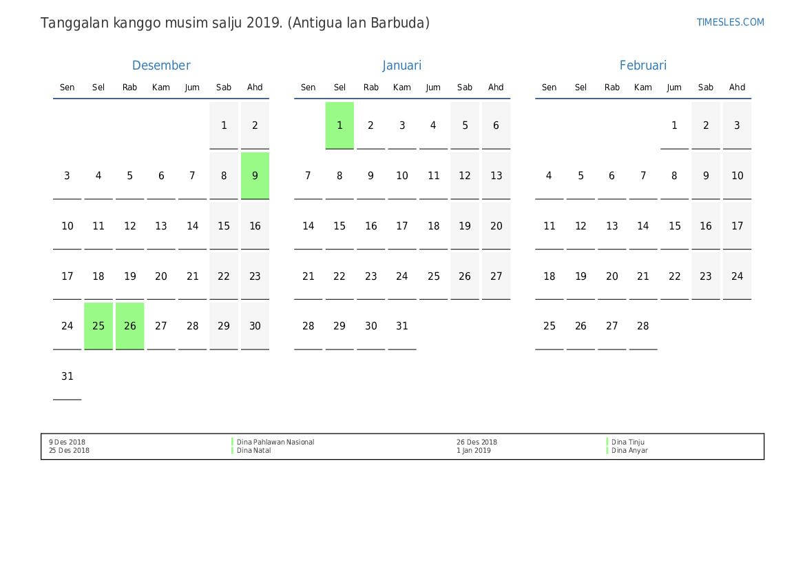 Download lan nyithak tanggalan PDF kanthi preinan lan akhir minggu kanggo musim salju taun 2019 kanggo Antigua lan Barbuda