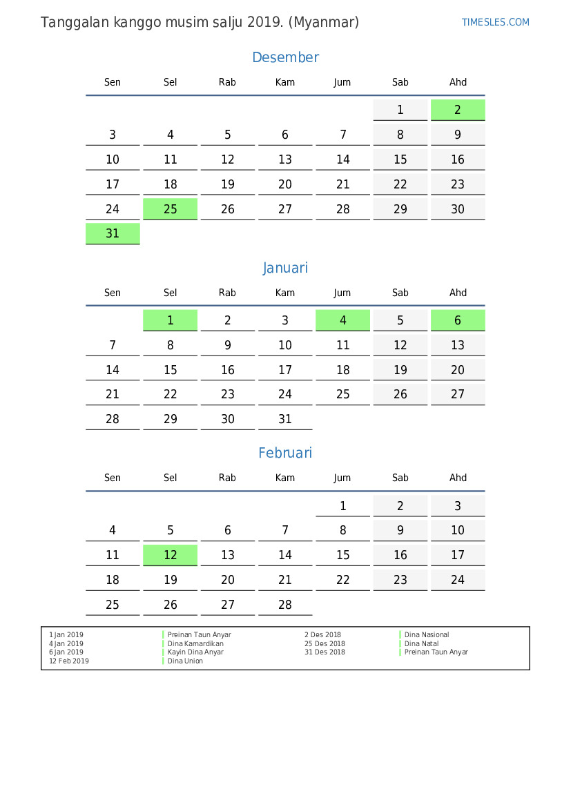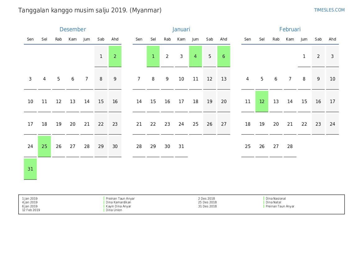 Kalender preinan lan akhir minggu kanggo musim salju taun 2019 kanggo Myanmar