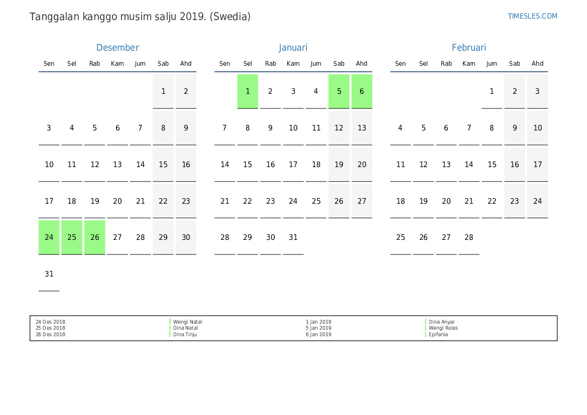 Download lan nyithak tanggalan PDF kanthi preinan lan akhir minggu kanggo musim salju taun 2019 kanggo Swedia
