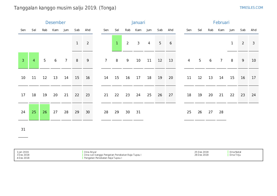Download lan nyithak tanggalan PDF kanthi preinan lan akhir minggu kanggo musim salju taun 2019 kanggo Tonga