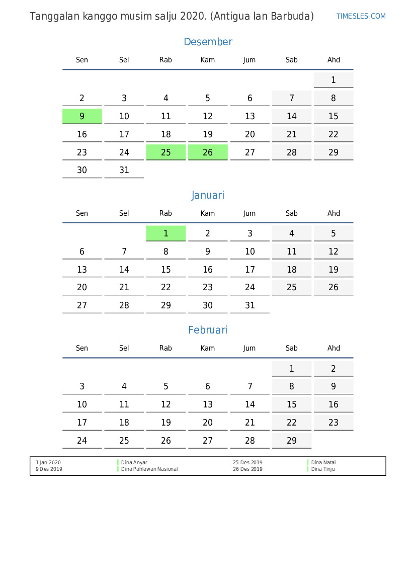 Download lan nyithak tanggalan PDF kanthi preinan lan akhir minggu kanggo musim salju taun 2020 kanggo Antigua lan Barbuda