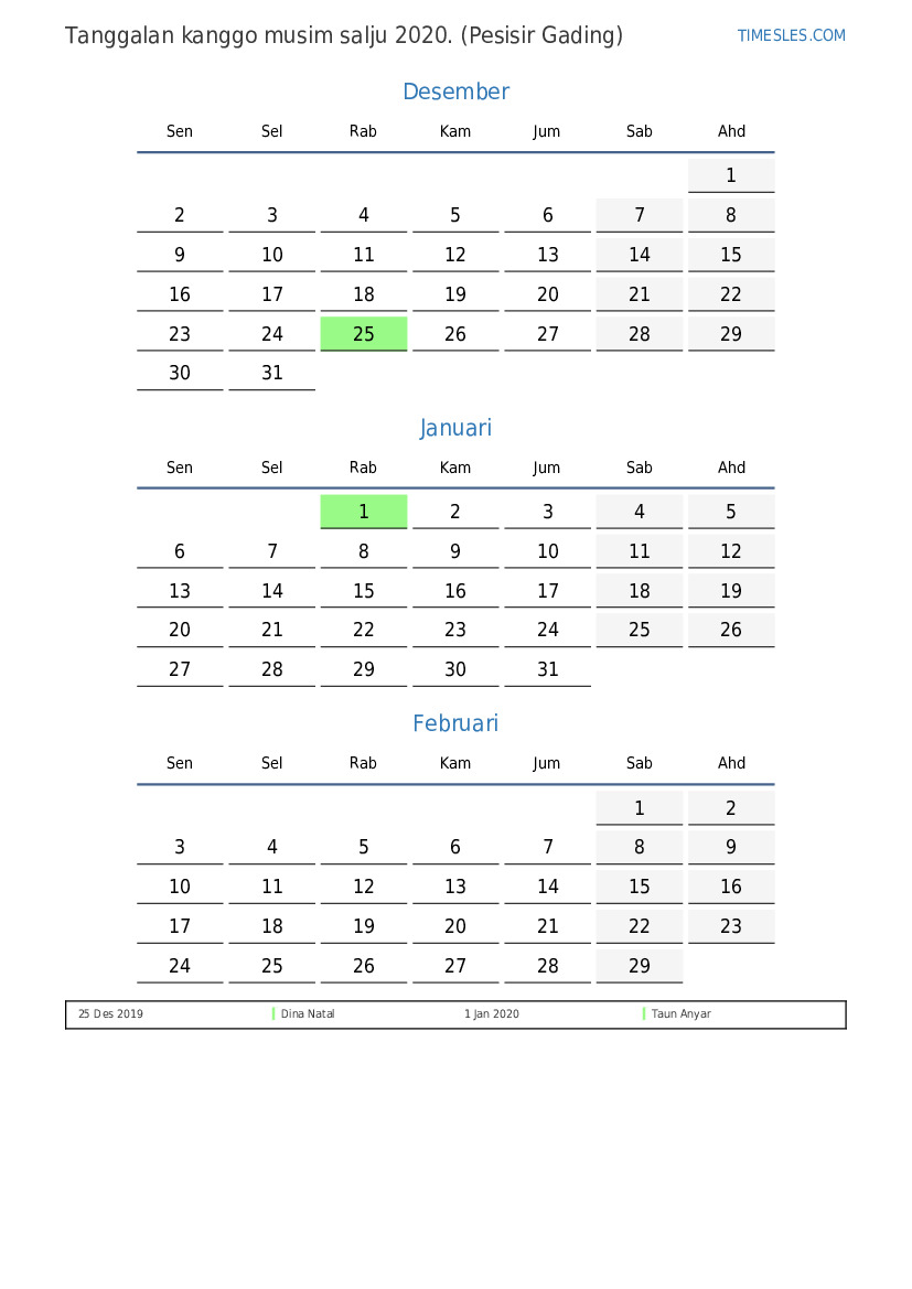 Download lan nyithak tanggalan PDF kanthi preinan lan akhir minggu kanggo musim salju taun 2020 kanggo Cote d'Ivoire