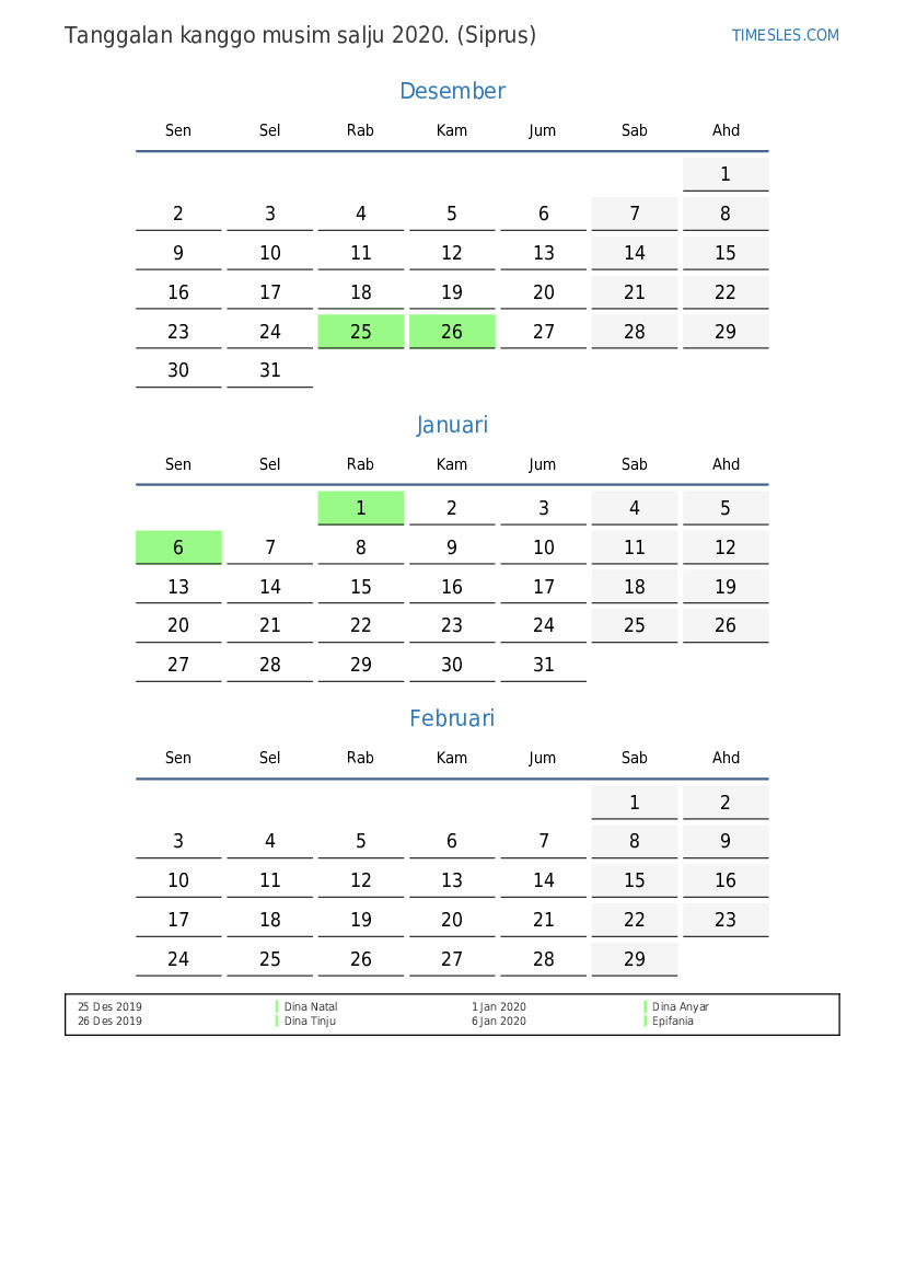 Download lan nyithak tanggalan PDF kanthi preinan lan akhir minggu kanggo musim salju taun 2020 kanggo Siprus