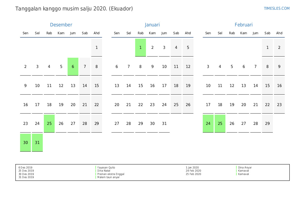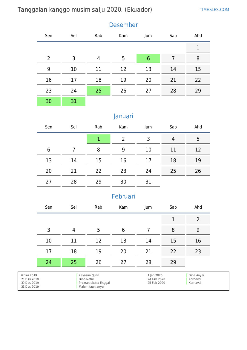 Download lan nyithak tanggalan PDF kanthi preinan lan akhir minggu kanggo musim salju taun 2020 kanggo Ekuador