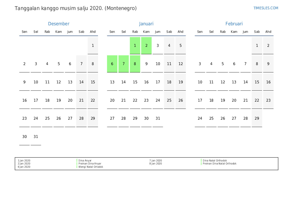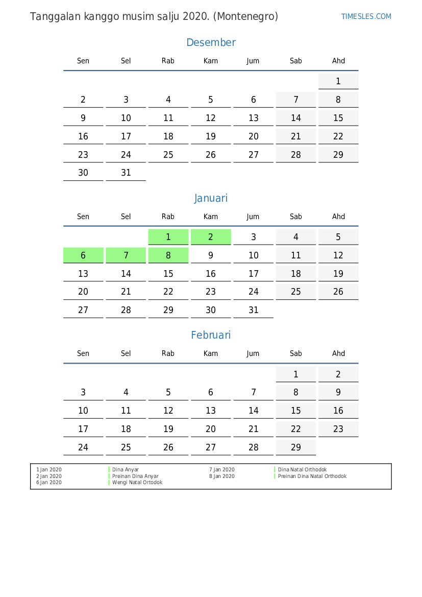 Download lan nyithak tanggalan PDF kanthi preinan lan akhir minggu kanggo musim salju taun 2020 kanggo Montenegro