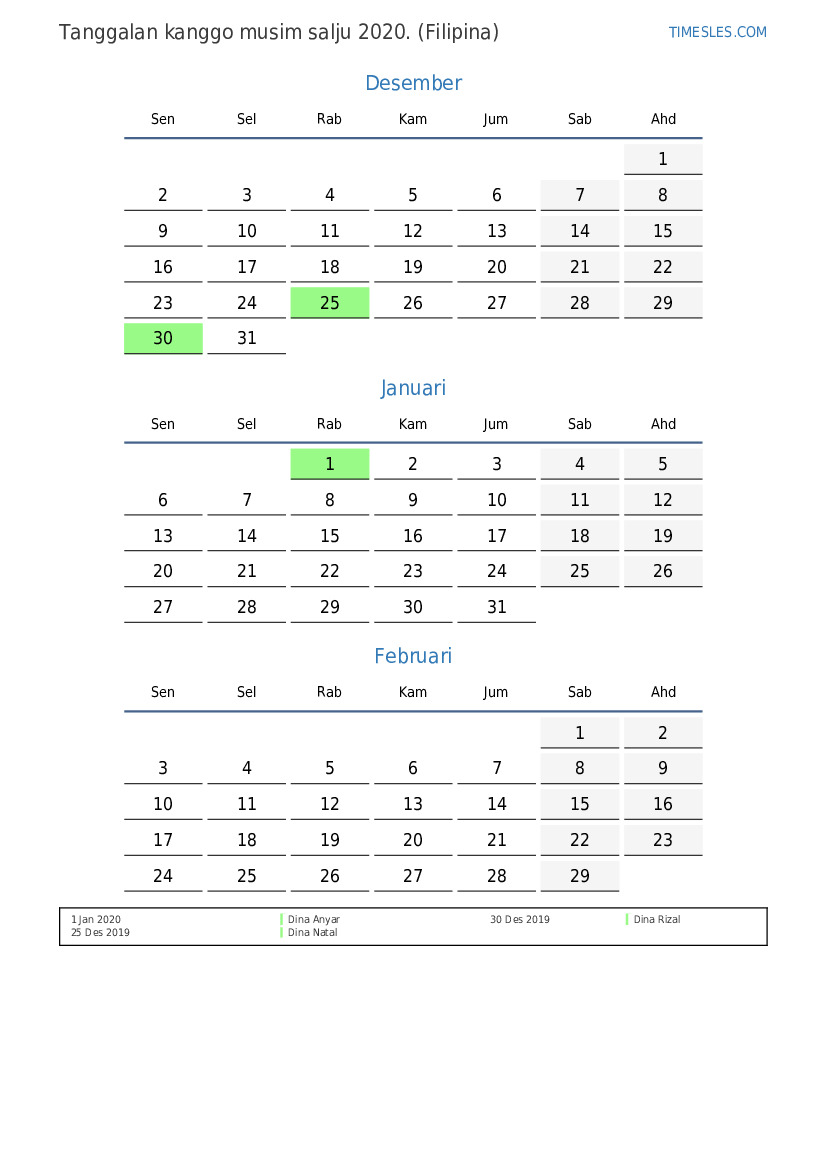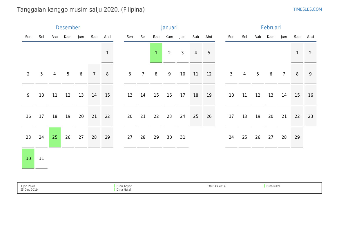 Download lan nyithak tanggalan PDF kanthi preinan lan akhir minggu kanggo musim salju taun 2020 kanggo Filipina