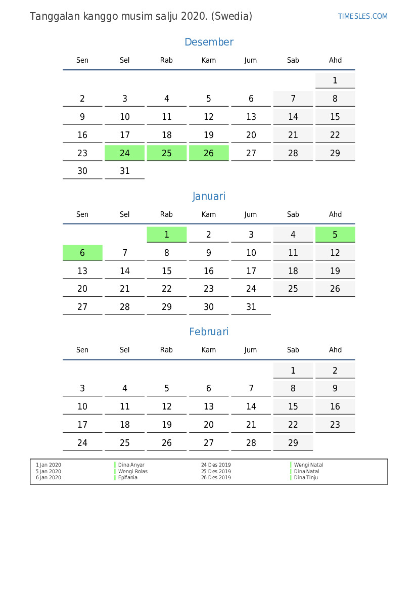 Download lan nyithak tanggalan PDF kanthi preinan lan akhir minggu kanggo musim salju taun 2020 kanggo Swedia