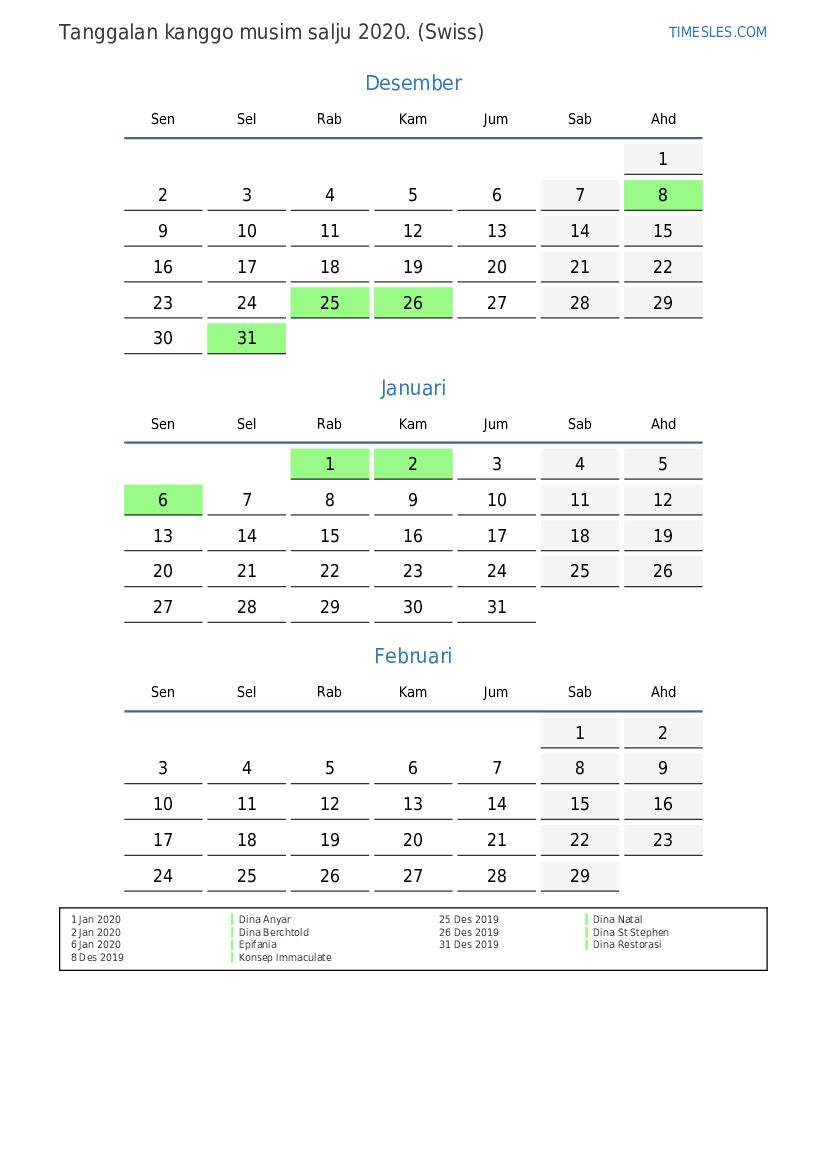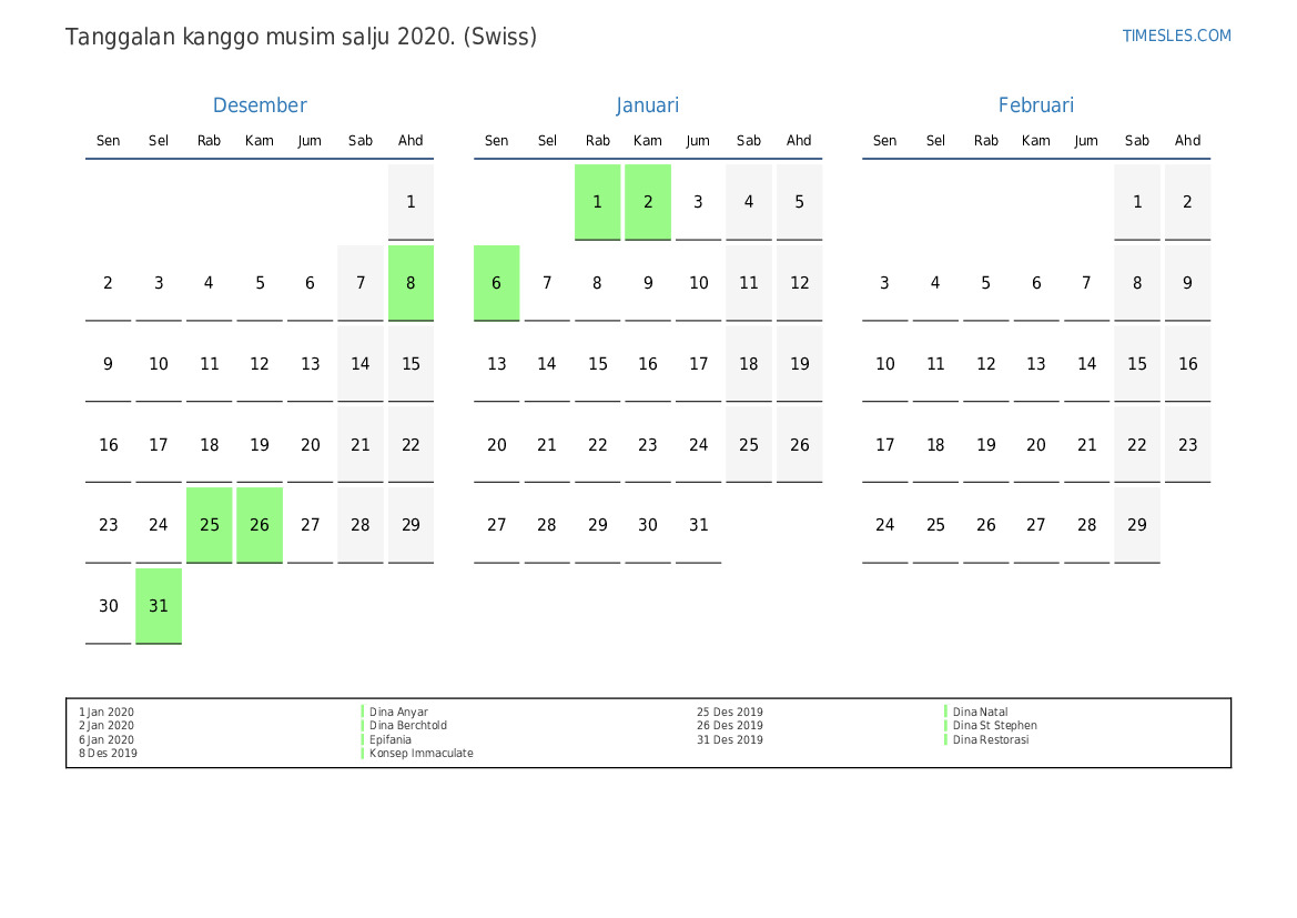 Download lan nyithak tanggalan PDF kanthi preinan lan akhir minggu kanggo musim salju taun 2020 kanggo Swiss