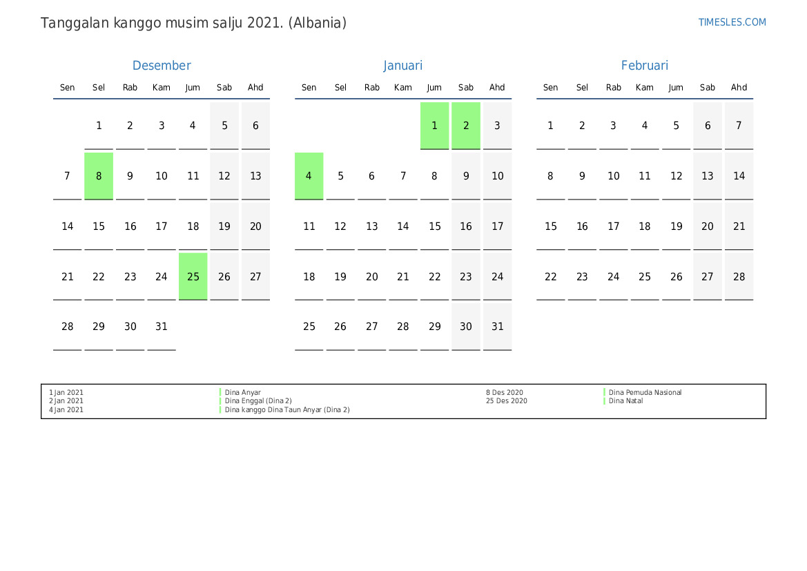 Download lan nyithak tanggalan PDF kanthi preinan lan akhir minggu kanggo musim salju taun 2021 kanggo Albania