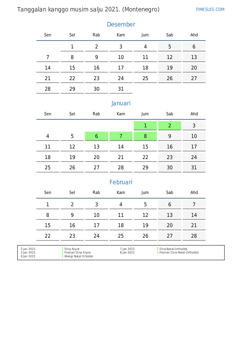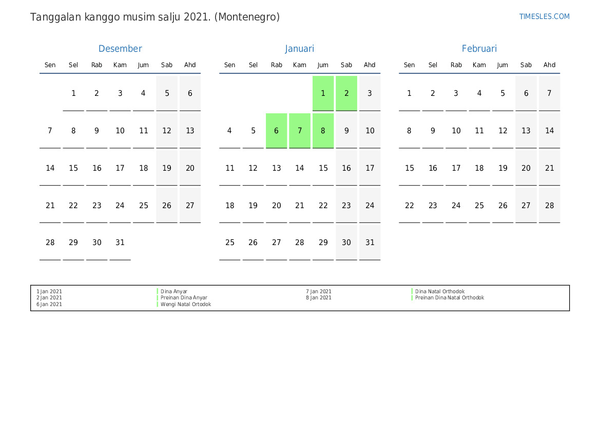 Download lan nyithak tanggalan PDF kanthi preinan lan akhir minggu kanggo musim salju taun 2021 kanggo Montenegro
