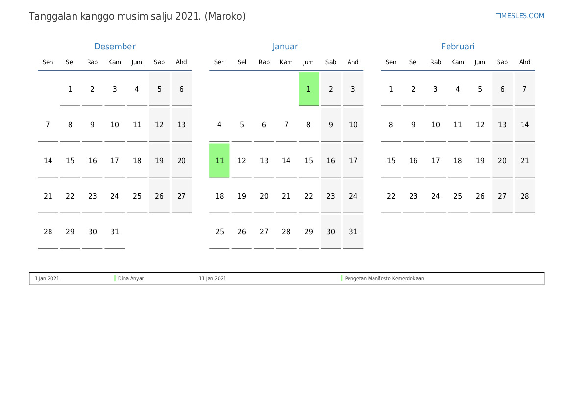 Download lan nyithak tanggalan PDF kanthi preinan lan akhir minggu kanggo musim salju taun 2021 kanggo Maroko