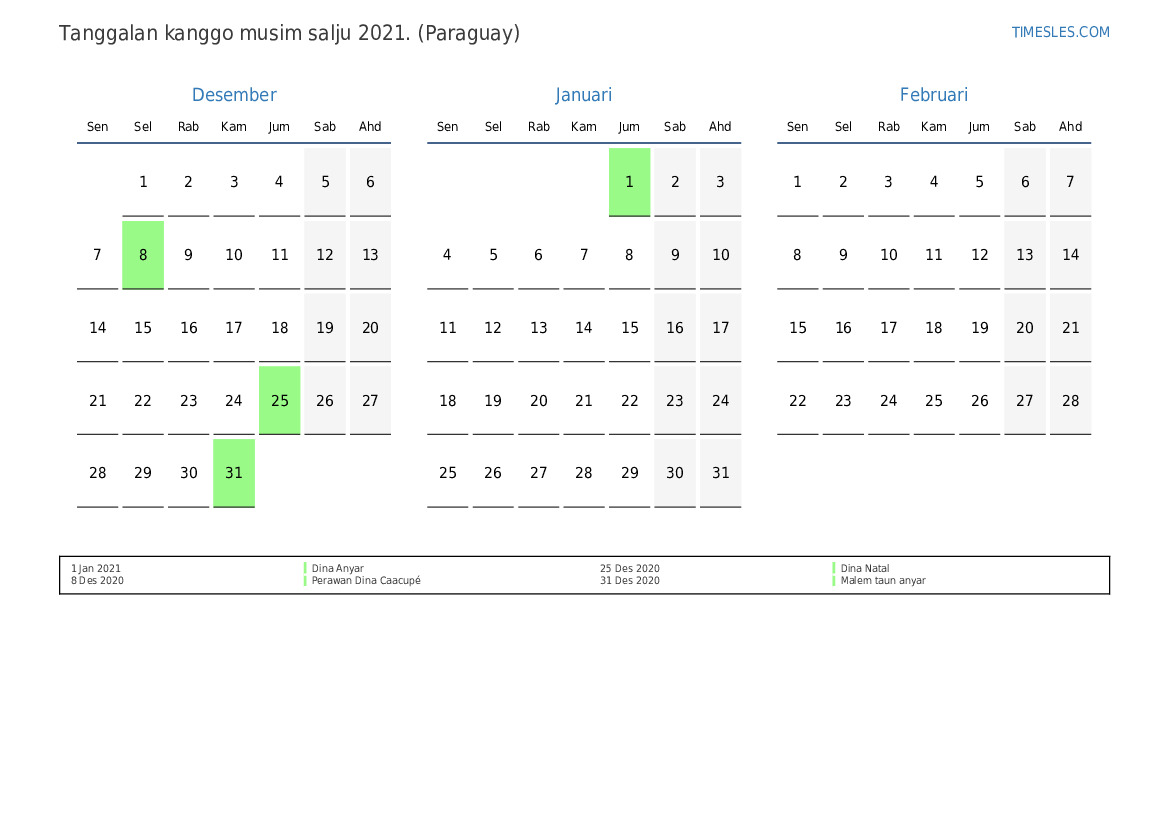 Download lan nyithak tanggalan PDF kanthi preinan lan akhir minggu kanggo musim salju taun 2021 kanggo Paraguay