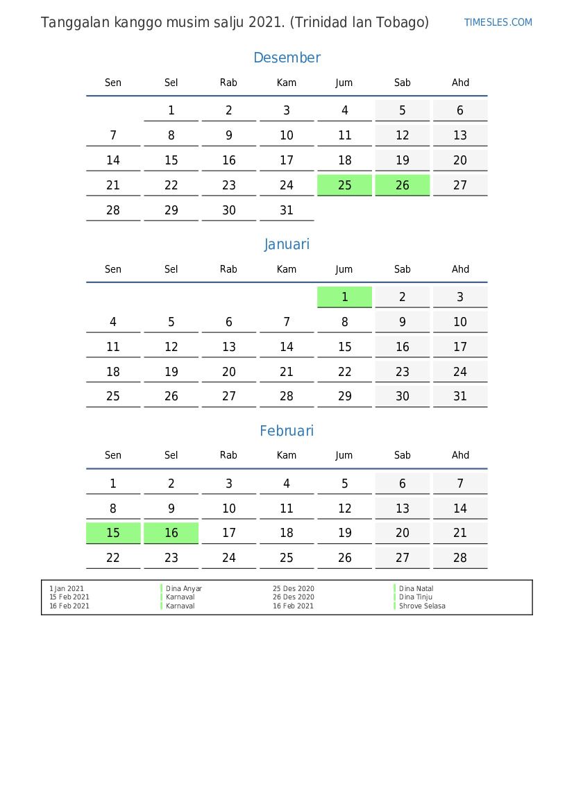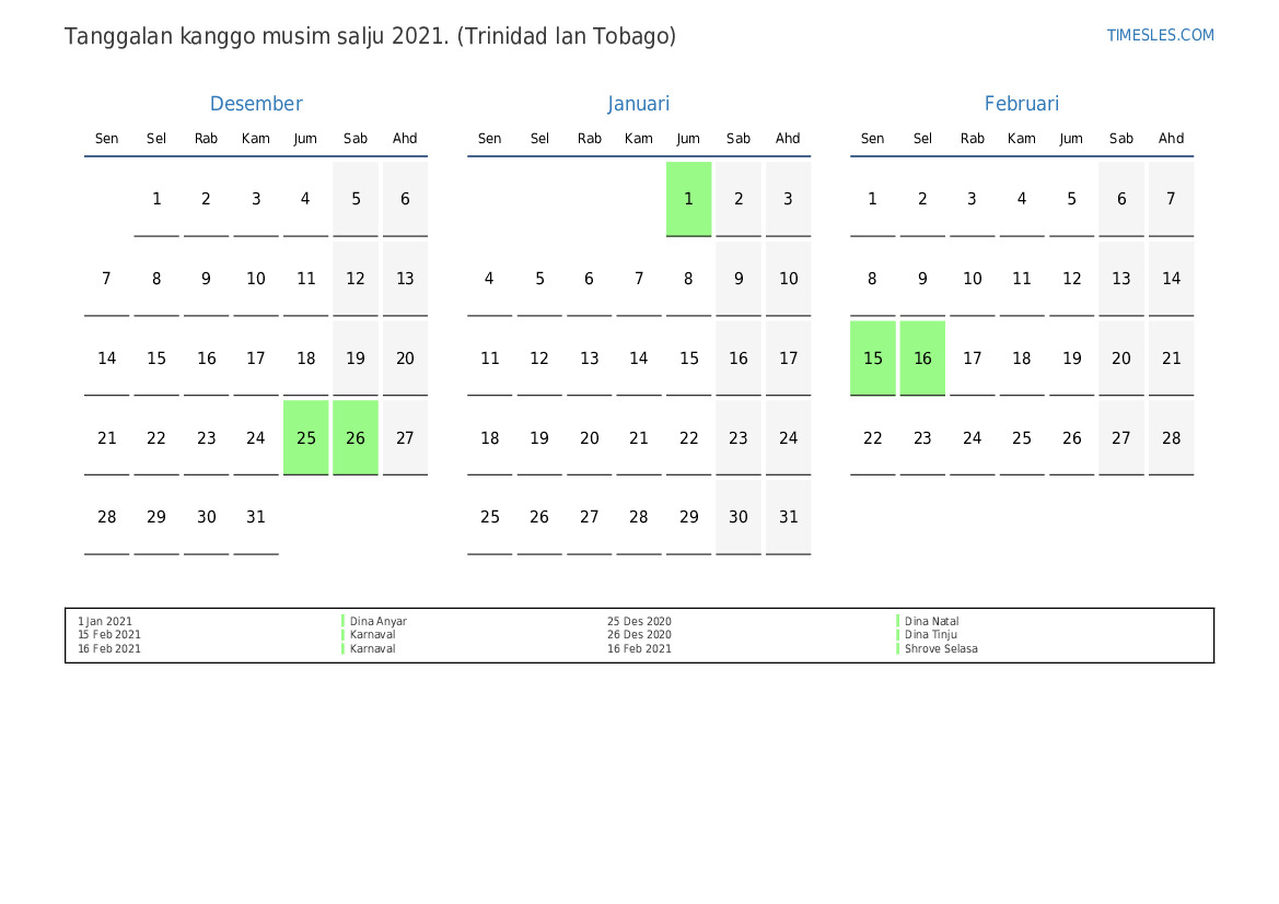 Download lan nyithak tanggalan PDF kanthi preinan lan akhir minggu kanggo musim salju taun 2021 kanggo Trinidad lan Tobago
