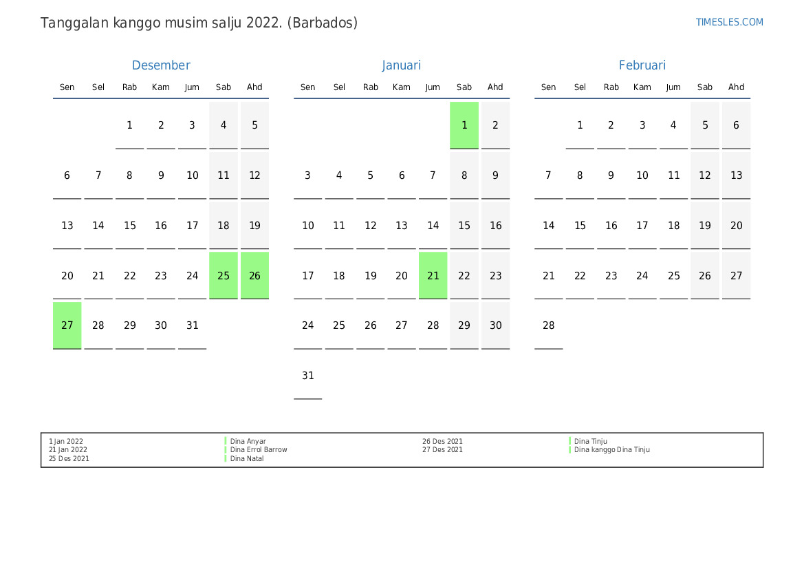Download lan nyithak tanggalan PDF kanthi preinan lan akhir minggu kanggo musim salju taun 2022 kanggo Barbados