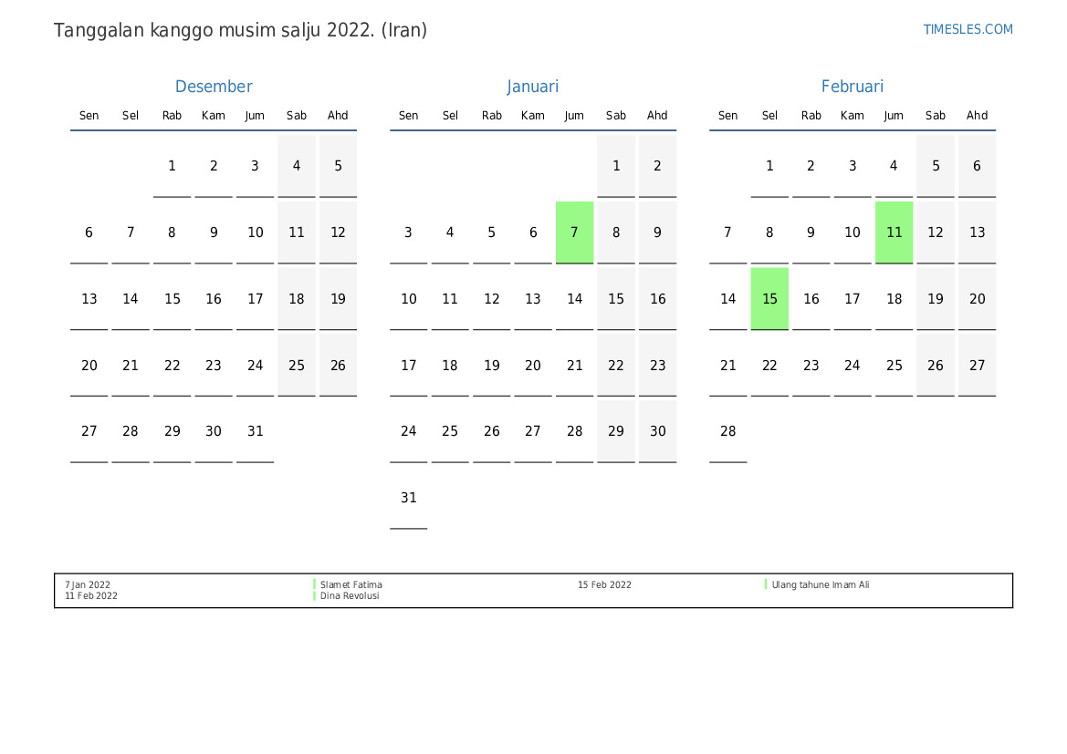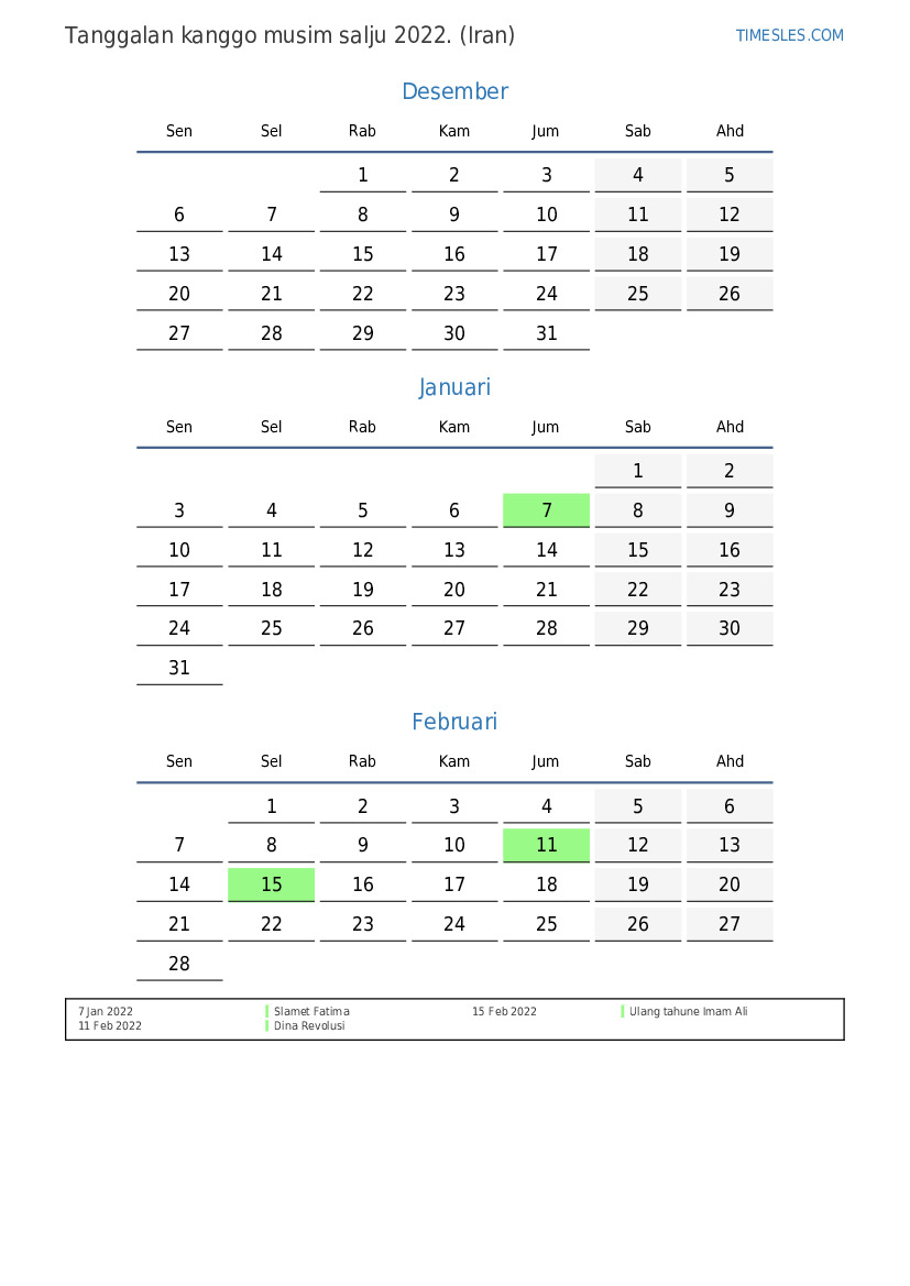 Download lan nyithak tanggalan PDF kanthi preinan lan akhir minggu kanggo musim salju taun 2022 kanggo Iran